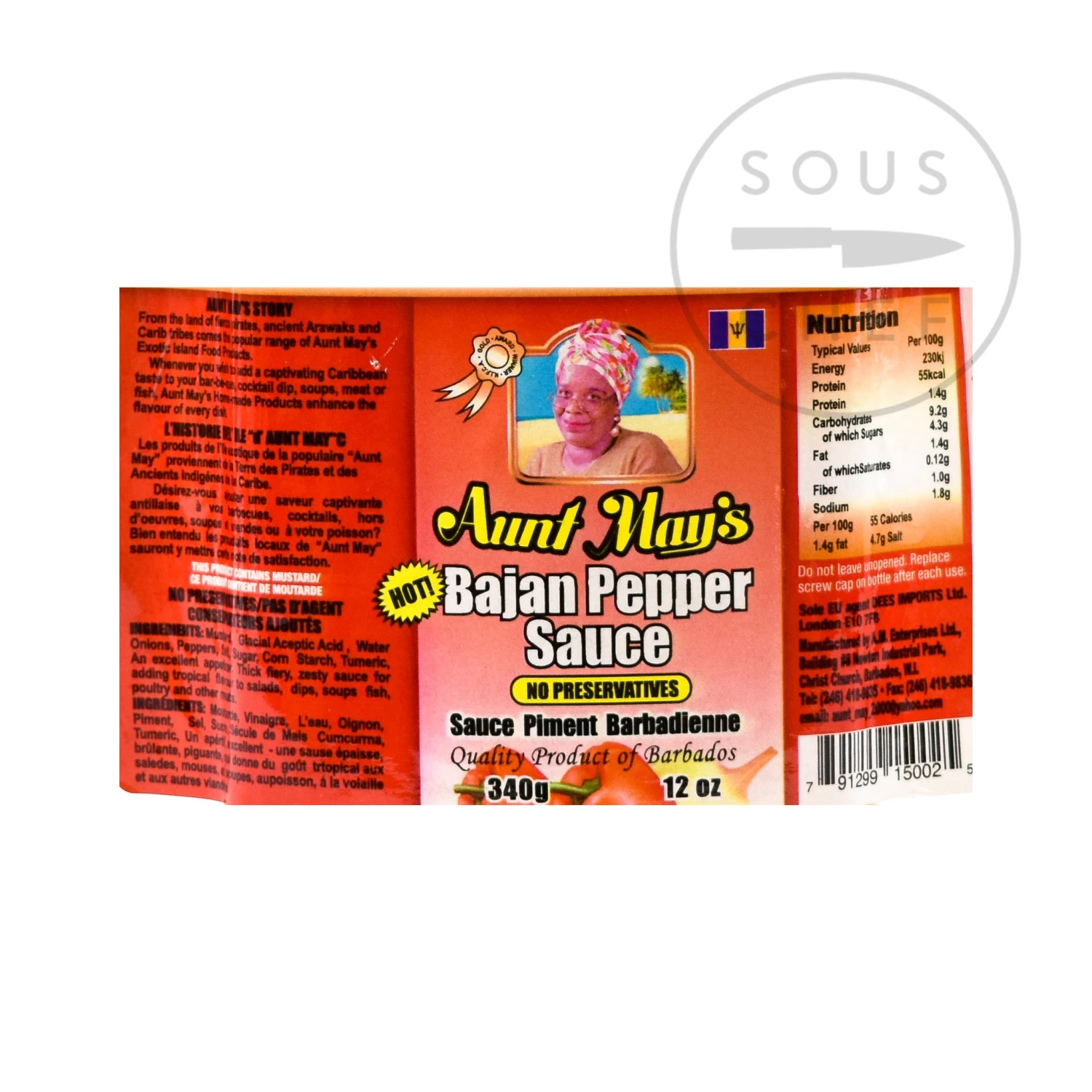 Aunt May’s Bajan Yellow Pepper Sauce is a versatile sauce with a strong mustard flavour and fiery kick from hot scotch bonnet peppers. Aunt May’s Yellow Pepper Sauce adds a spicy, mustardy zing to salad dressings, barbecued meats, fish, hot dogs and sandwiches.