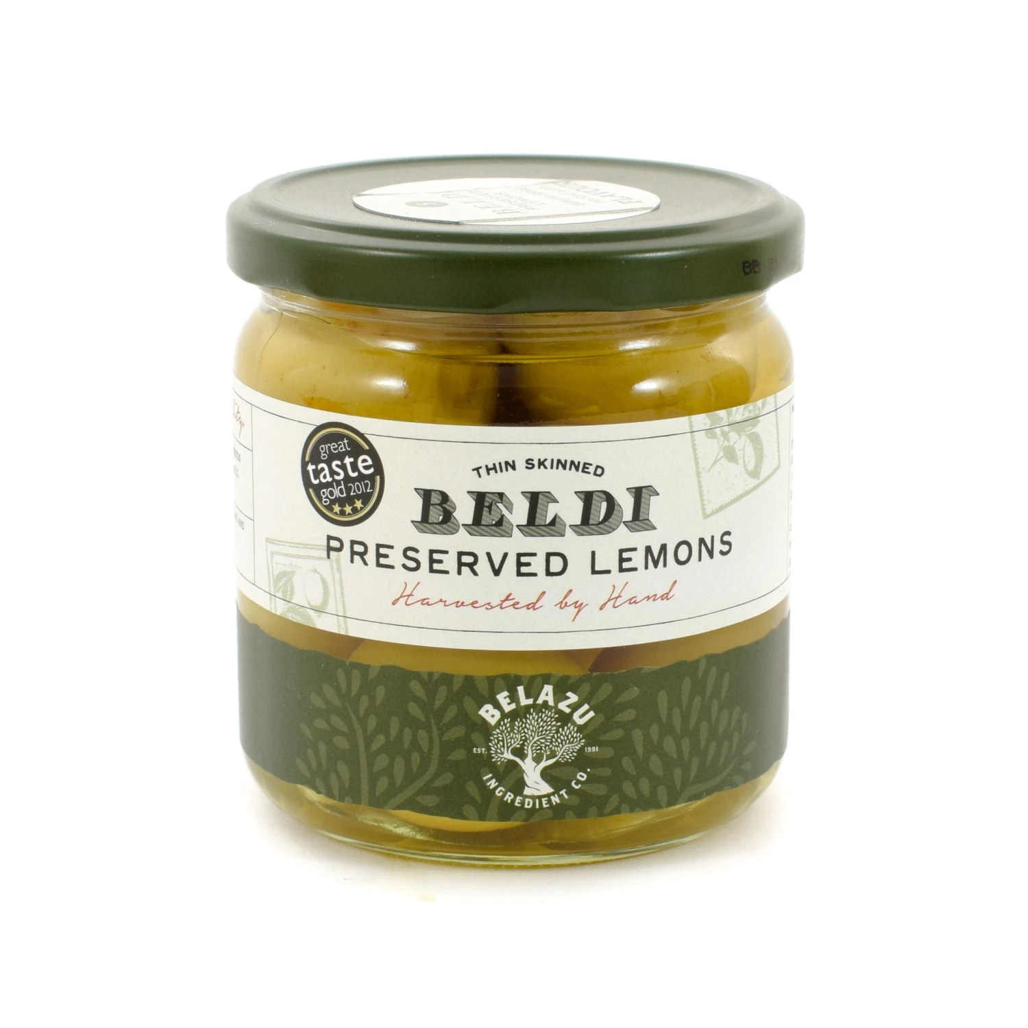 Belazu preserved lemons are lemons preserved in salt and water. During the preserving process the lemons lose thier sharpness but their flavour intensifies. The preserved lemons are the authentic Beldi lemon variety, and are hand sorted and graded for size and quality. They are then hand packed to ensure that the fruit doesn’t bruise and retains its fragrant aroma.