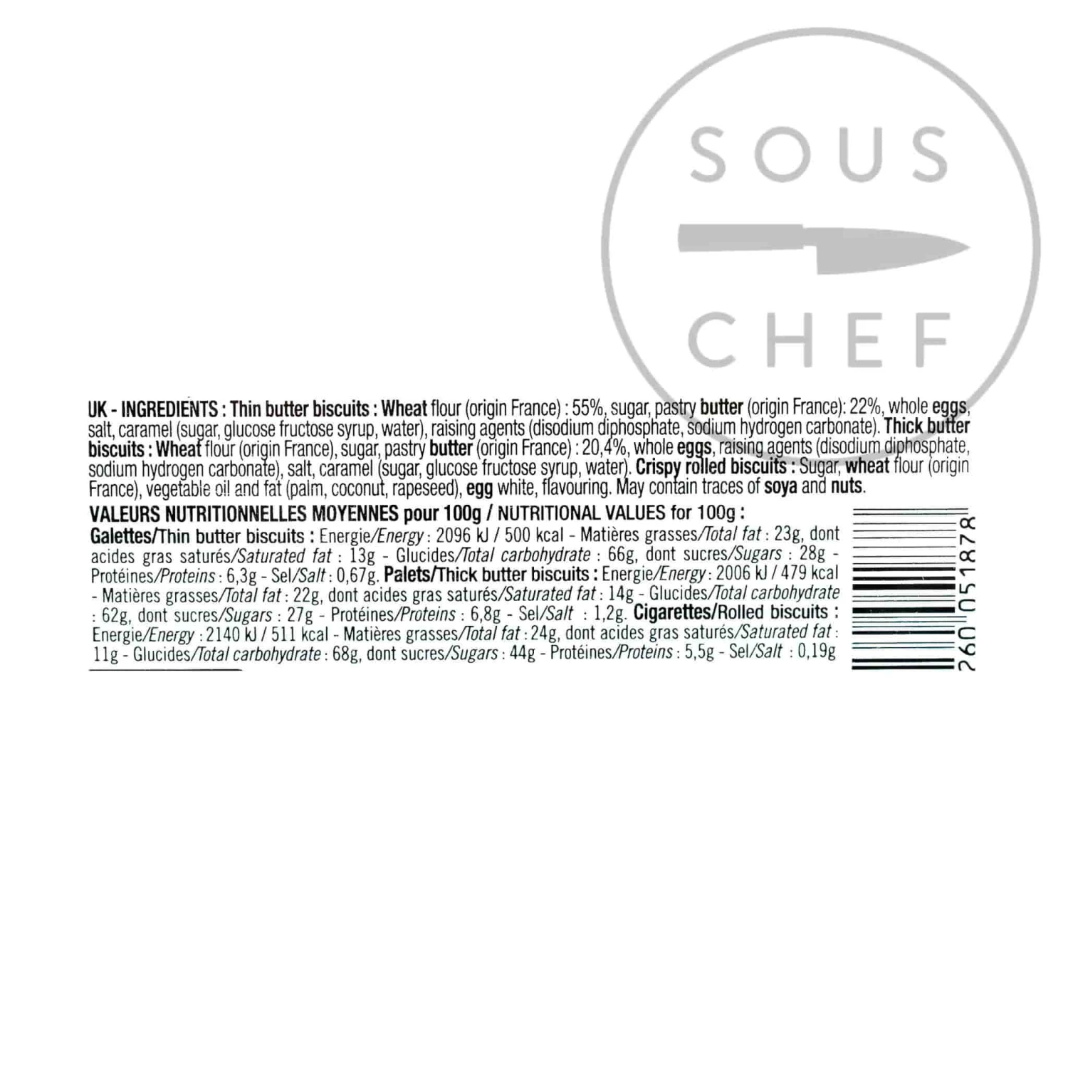 Ingredients: Thin butter biscuits: Wheat flour (origin France): 55%, sugar, pastry butter (origin France): 22%, whole eggs, salt, caramel (sugar, glucose, fructose syrup, water), raising agents (disodium diphosphate, sodium hydrogen carbonate). Thick butter biscuits: Wheat flour (origin France), sugar, pastry butter (origin France): 20.4%, whole eggs, raising agents (disodium diphosphate, sodium hydrogen carbonate), salt, caramel (sugar, glucose fructose syrup, water). Crispy rolled biscuits: sugar, wheat flour (origin France), vegetable oil and fat (palm, coconut, rapeseed), egg white, flavouring.