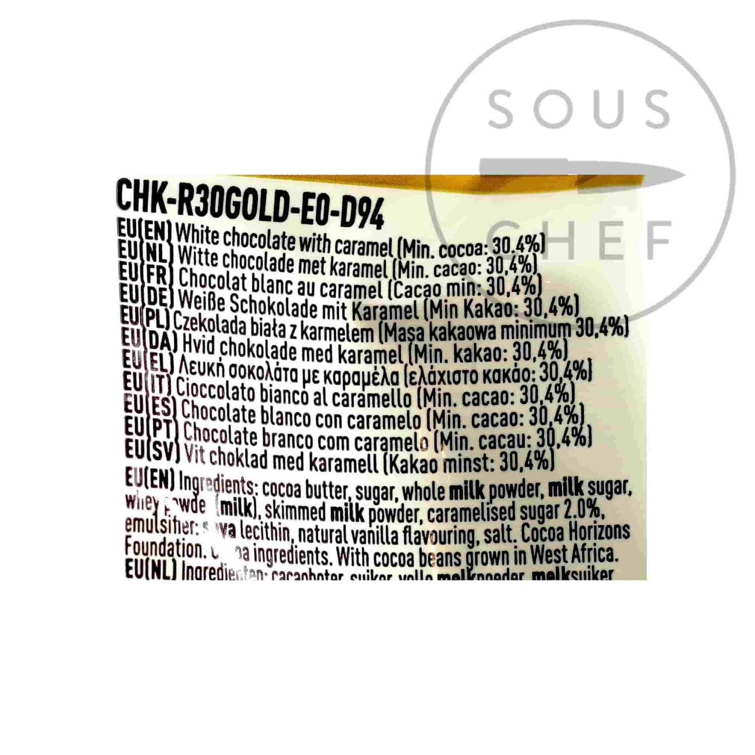 This pre-tempered 30.4% caramel couverture is a blend of three different beans from the Ivory Coast, Ghana and Ecuador. Made with caramelised sugar, caramelised milk and a sprinkle of salt, this toffee-like chocolate has a golden hue.Â