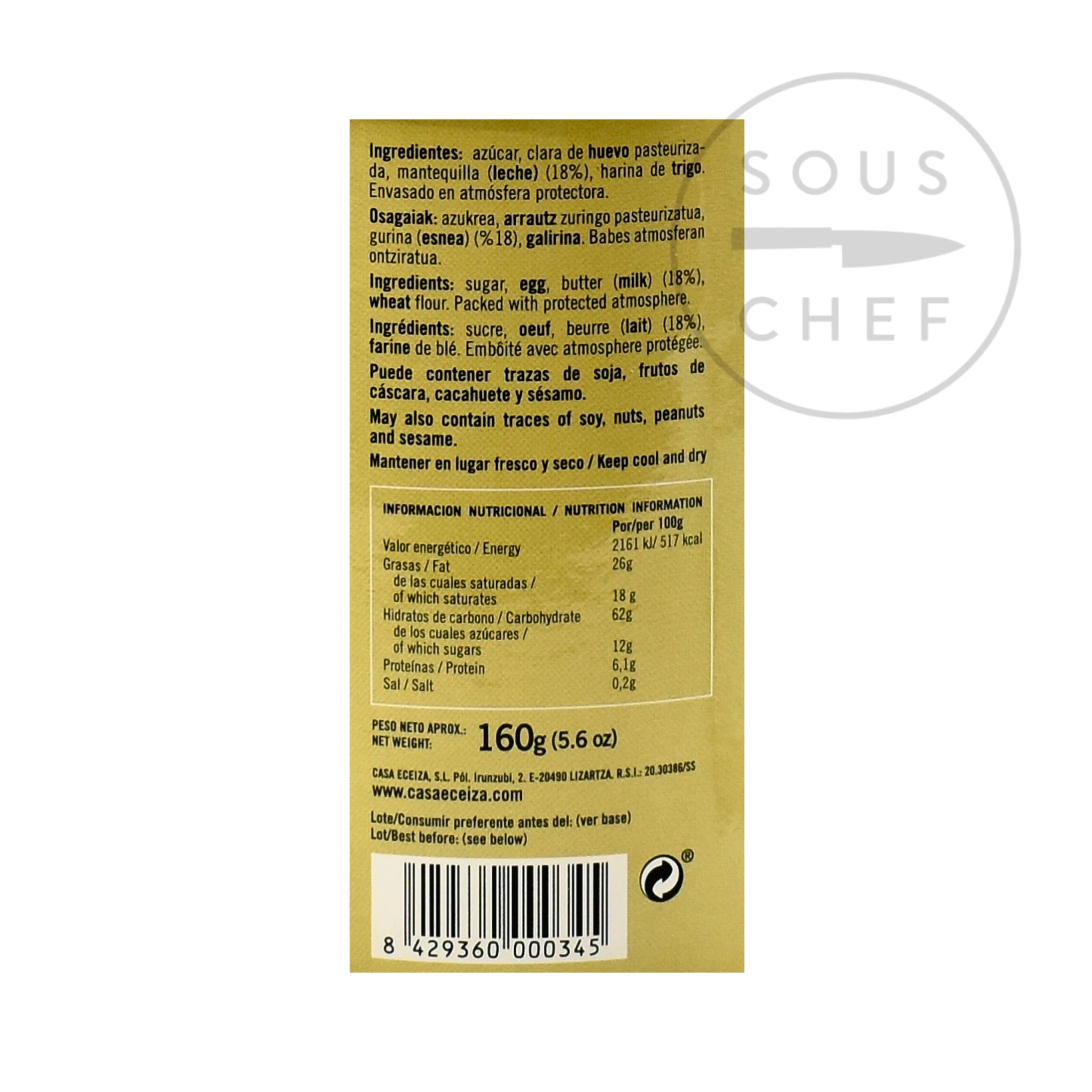 Ingredients: sugar, egg, butter (milk) (18%), wheat (gluten) flour.