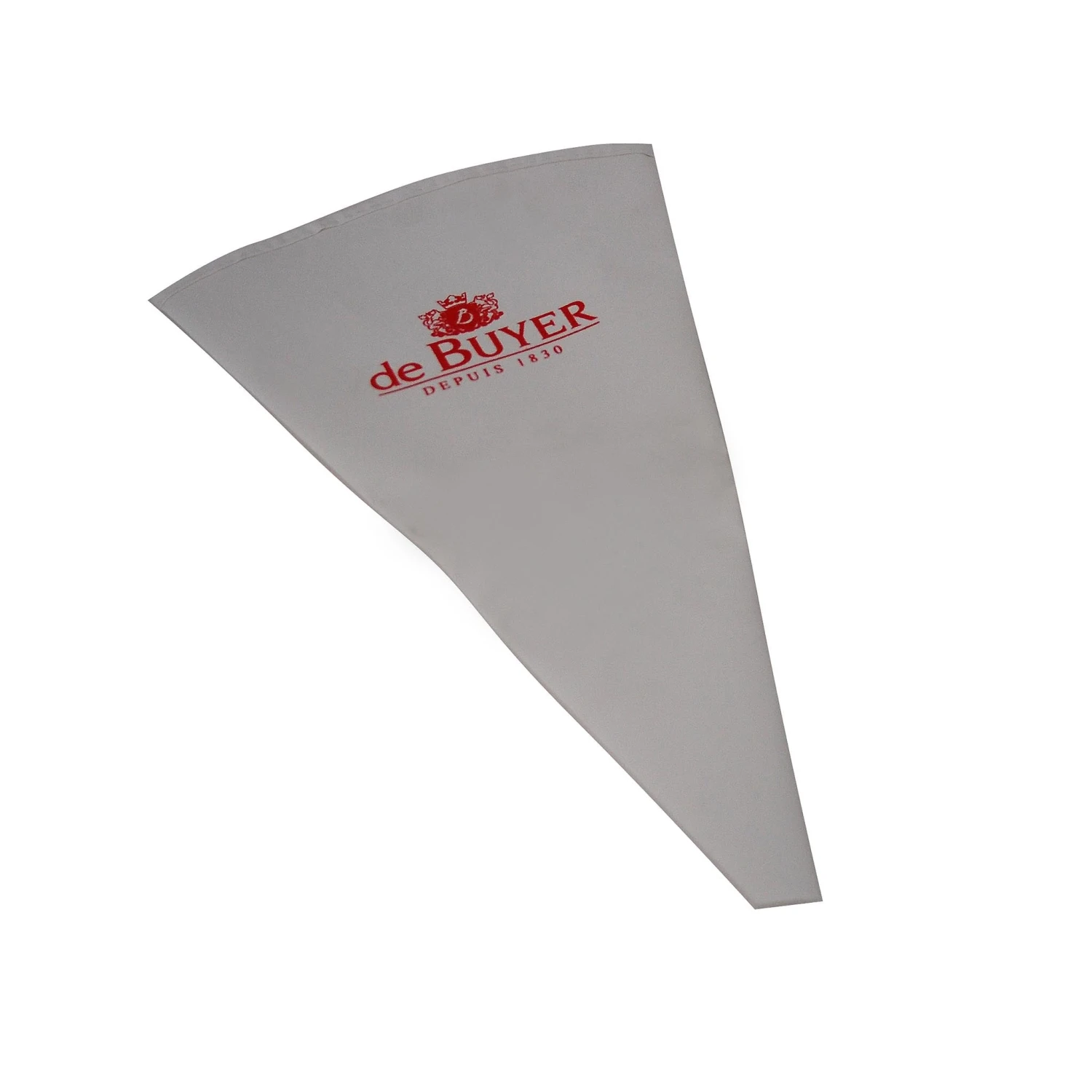 The coated cotton piping bag fits most De Buyer stainless-steel piping nozzles, but you can cut to fit your existing piping nozzles, too. The reinforced tip of the piping bag is rather rigid when new – just soak in warm water before use to make it more supple.