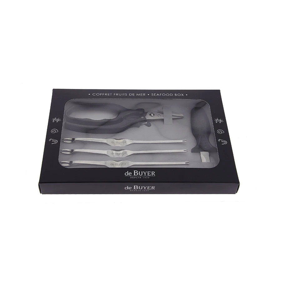 The De Buyer shellfish set comes with the essential tools to tackle most shellfish and seafood. The set includes: