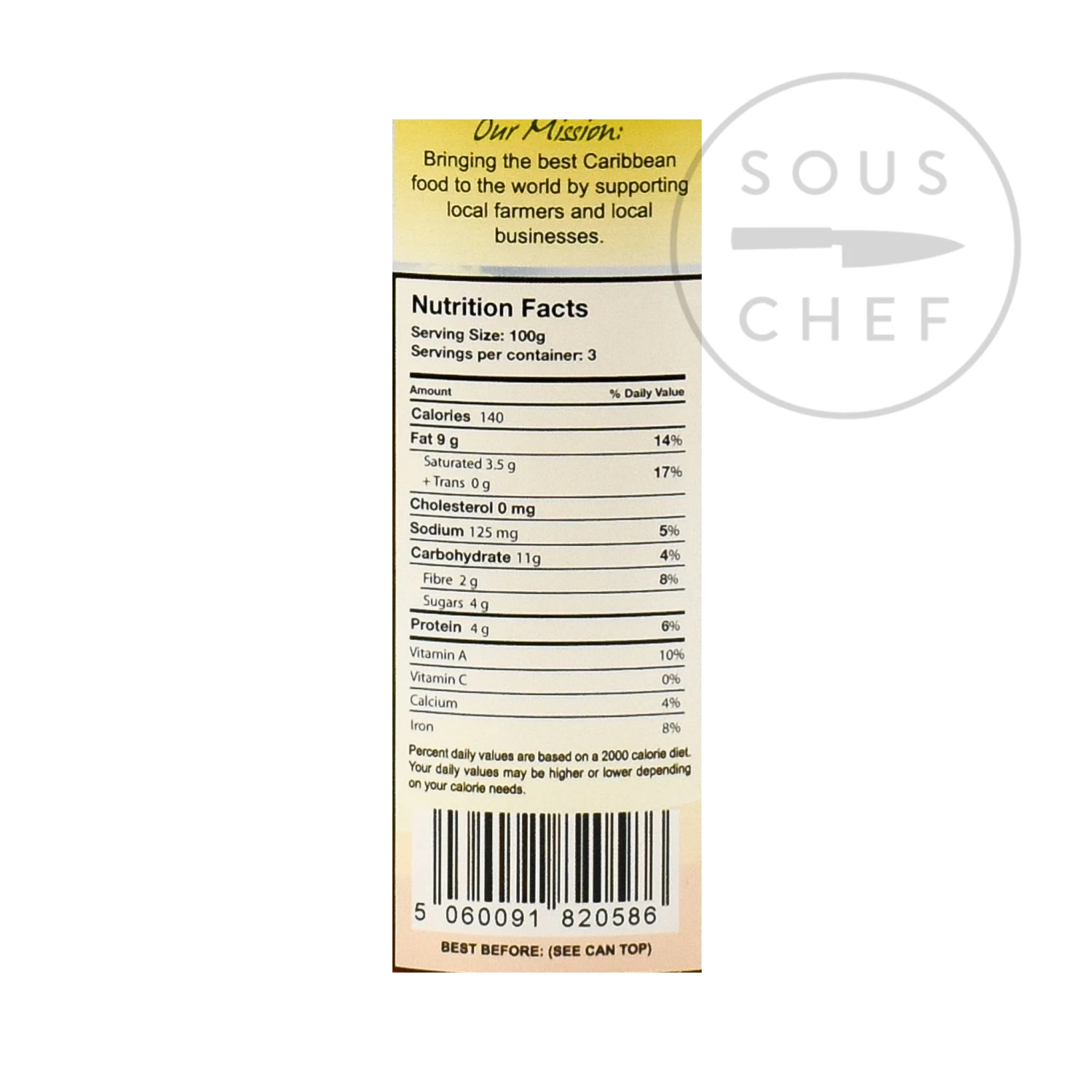 Ackee is a large red tree-fruit, not dissimilar to the cocoa pod, and the yellow flesh is picked from around its three seeds to eat. Ackee’s thick starchy fruit pulp has hints of sourness, and a light tree sap flavour. The fruit is lightly boiled and salted before canning, so is ready to eat.