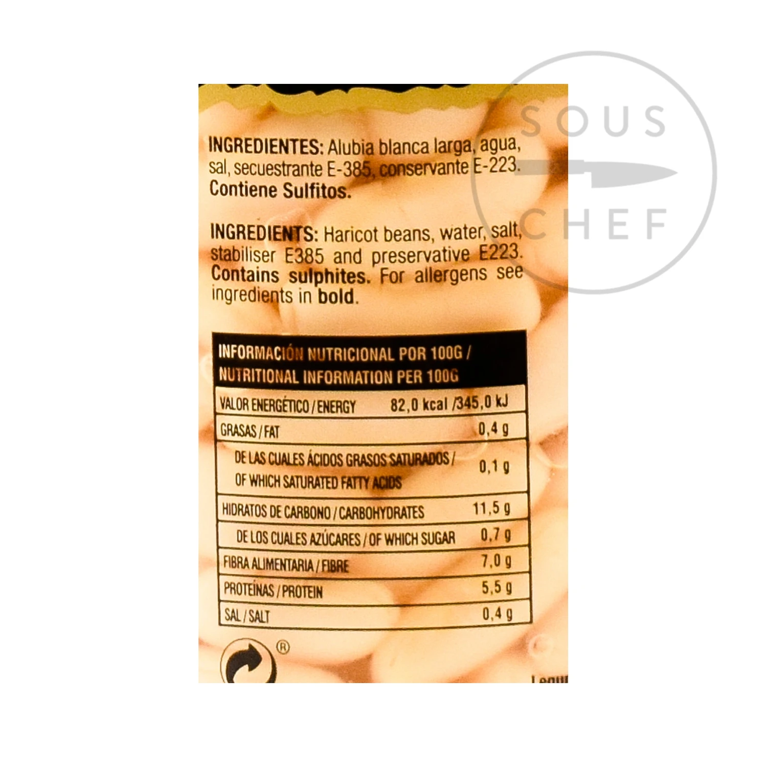 Ingredients: haricot beans, water, salt, stabiliser (E385), preservative (E223). Contains sulphites.