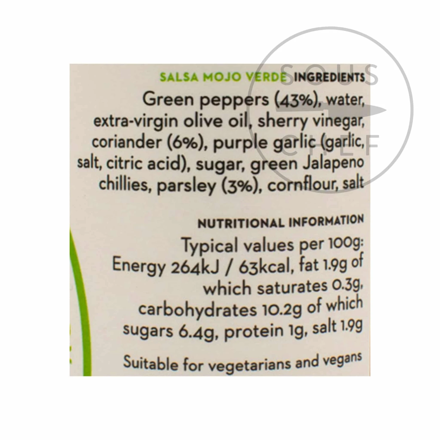 Ingredients: Green peppers (43%), water, extra-virgin olive oil, sherry vinegar, coriander (6%), purple garlic (garlic, salt, citric acid), sugar, green Jalapeno chillies, parsley (3%), cornflour, salt.Â