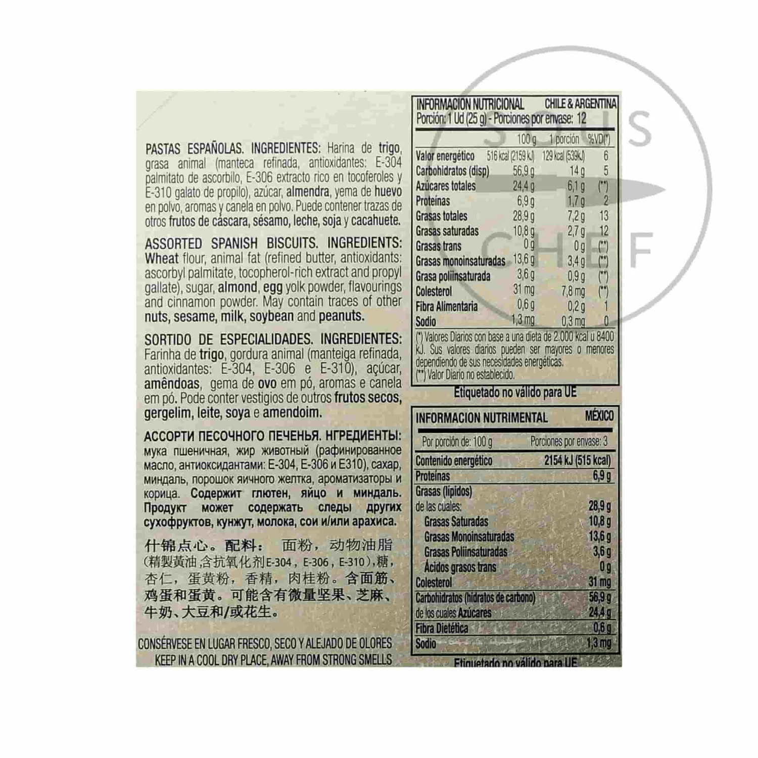 Ingredients: wheat flour, animal fat (refined butter, antioxidants,: ascorbyl palmitate, tocopherol-rich extract and propyl gallate), sugar, almond, egg yolk powder, flavourings, cinnamon powder.