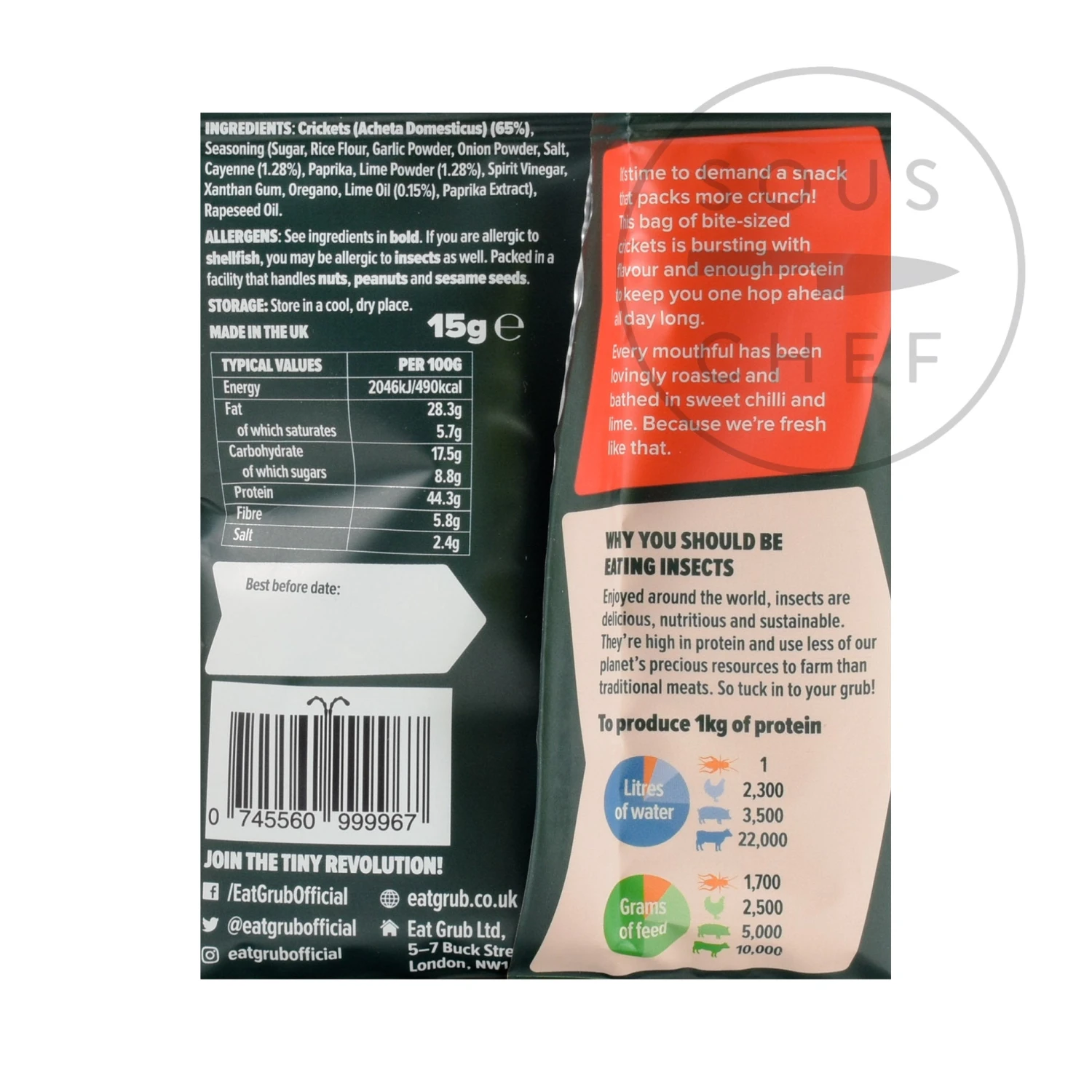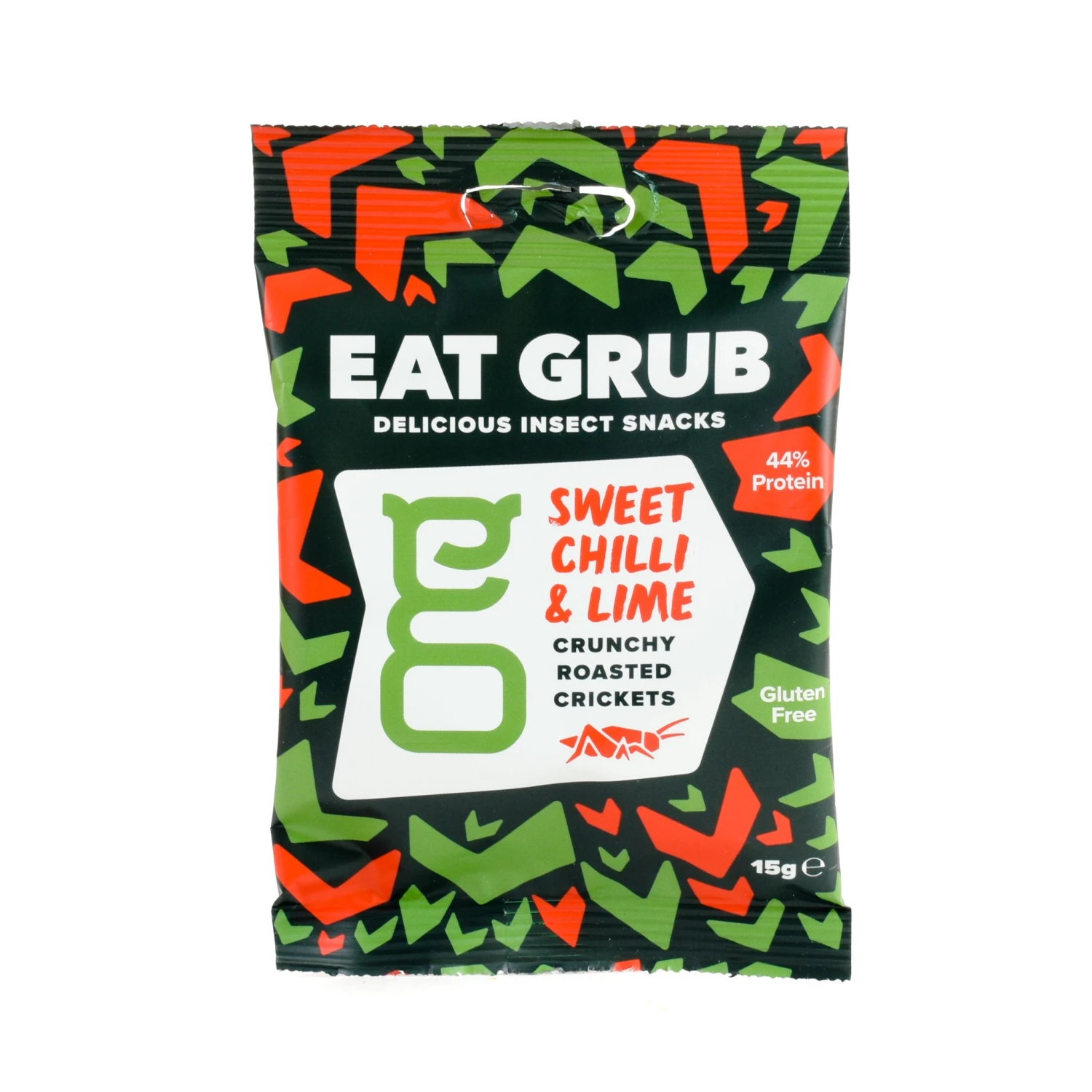 Eat Grub sweet chilli & lime crickets are a fun, sustainable alternative to crisps and nuts on their own, or even as a topping for tacos and fajitas. This pocket-sized snack pack contains roasted crickets with hot, sweet and zesty chilli-lime seasoning.