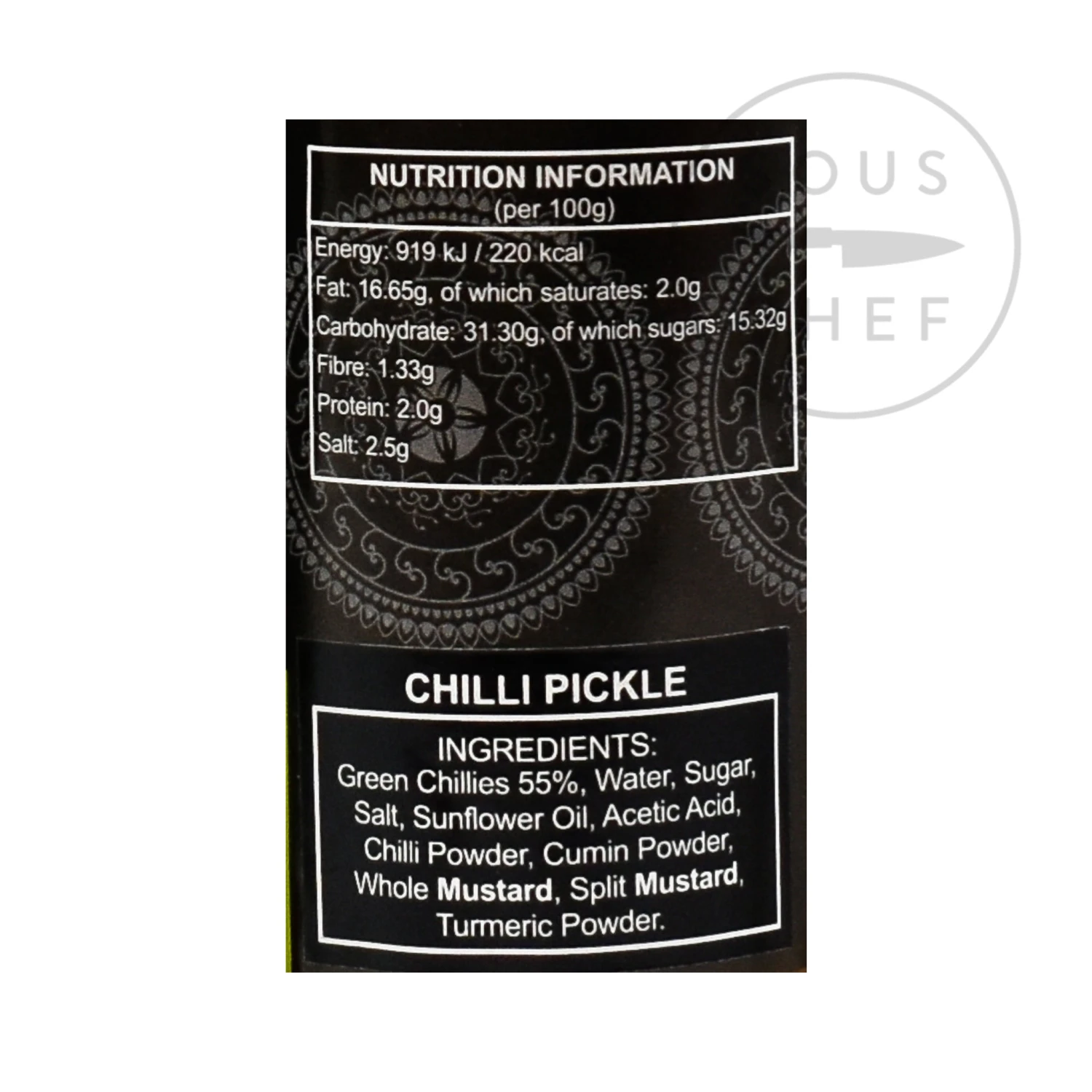 Ingredients: Green chillies 61%, sugar, sunflower oil, water, salt, acetic acid, chilli powder, cumin powder, whole mustard, split mustard, turmeric powder. Contains mustard.