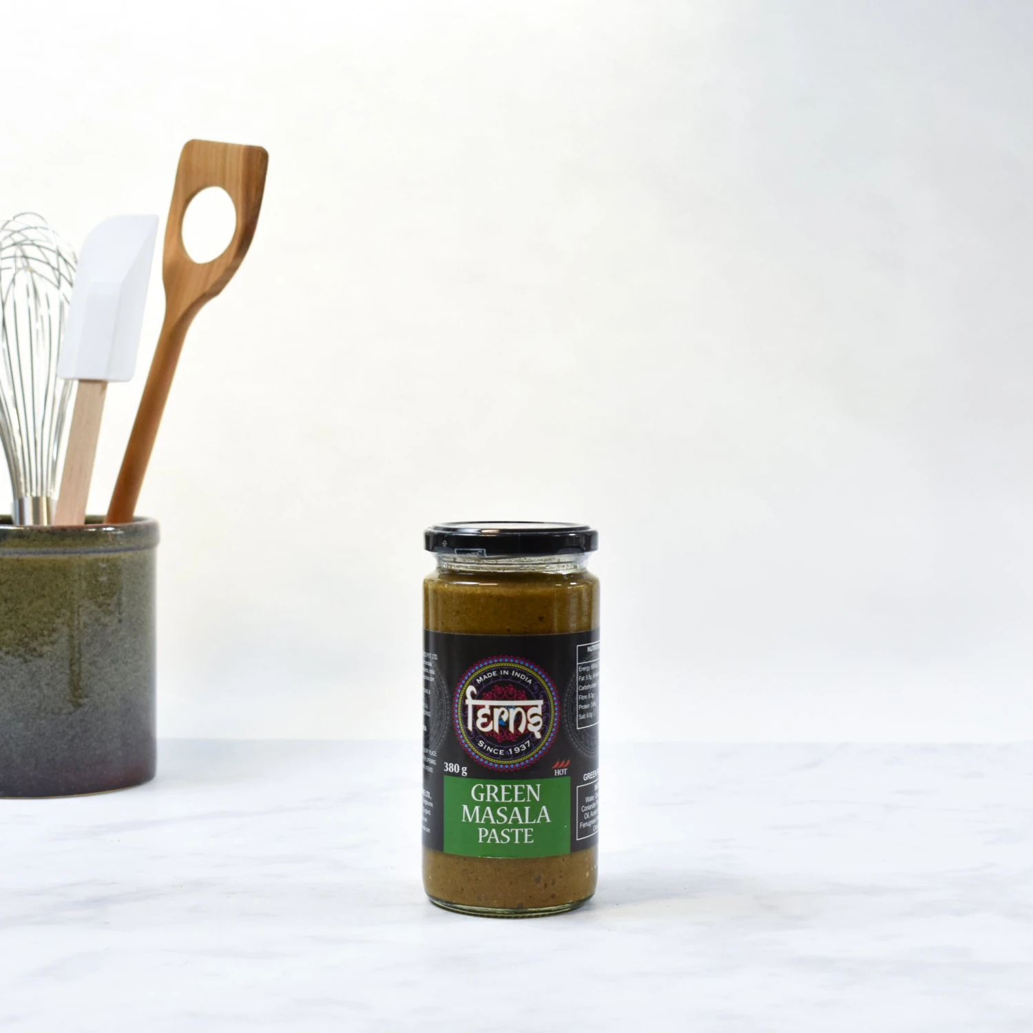 Ferns’ green masala paste is a rich, green curry paste made with green chillies and coriander. Green masala paste works especially well mixed with coconut milk in fish and shellfish curries. Also try stirring a little green masala paste into a simple dal.