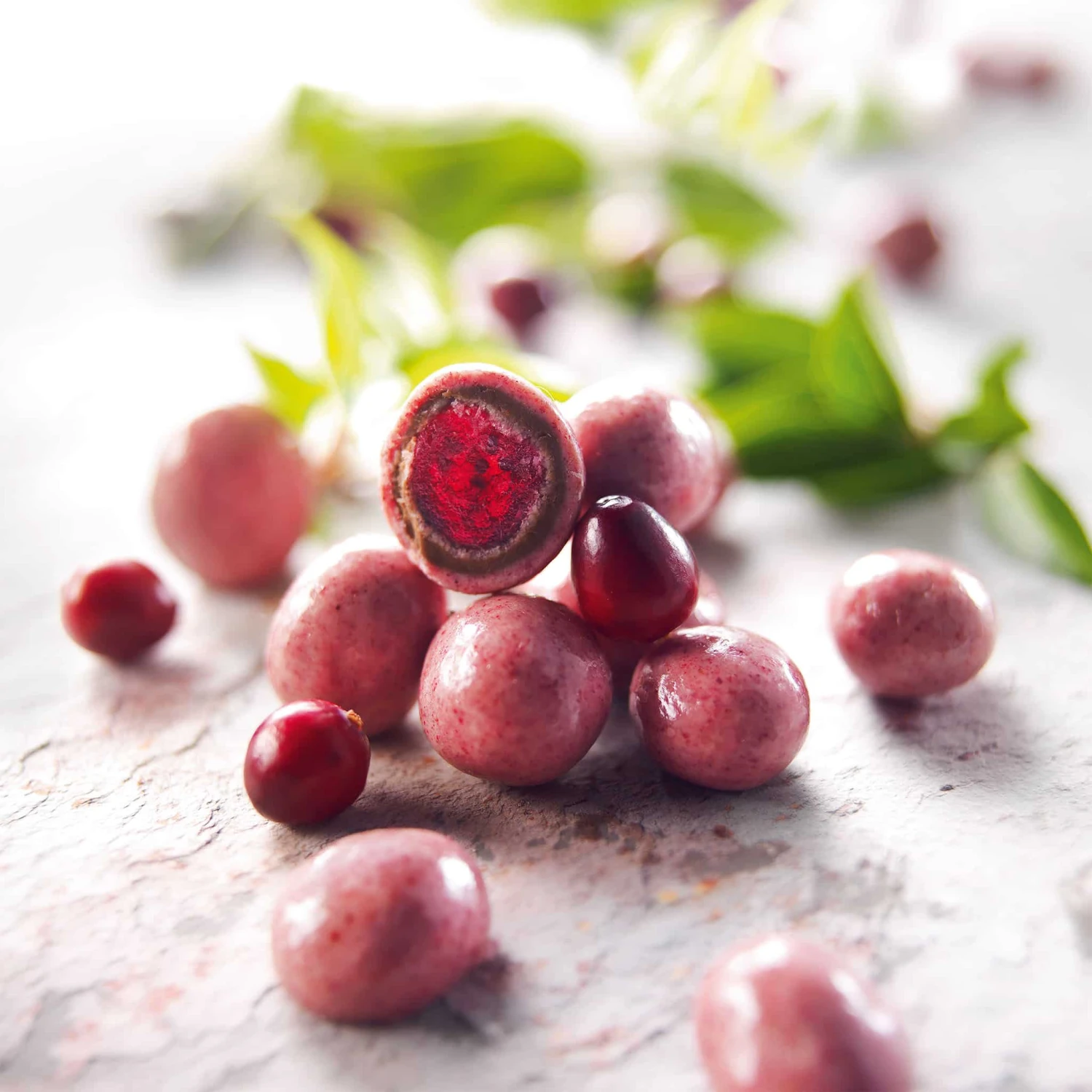 Francois Doucet cranberry & double chocolate marzipan spheres are beautiful ruby gems, with layers of texture and flavour. Crack through the cranberry-coated shell chocolate shell, before discovering the hidden layer of marzipan, and the fruity cranberry centre. A fantastic treat to enjoy with coffee after dinner, or a great stocking filler for any food lover.