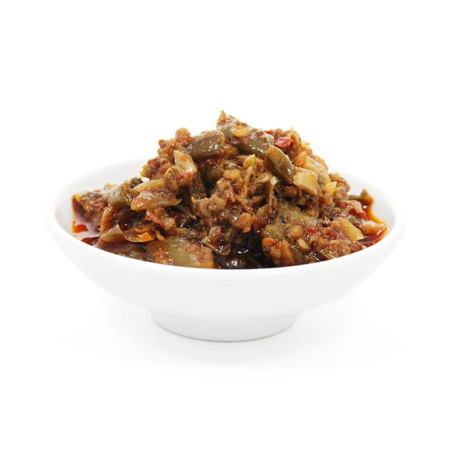 These intensely fiery pickles are served to spice up plain noodle and tofu dishes. They are best though of as a pickled vegetable-rich Sichuan chilli oil. Use in the same way you would use chopped Sichuan preserved vegetable in recipes. The pickles are a blend of chilli, preserved vetable, cowpea (like a green bean), Chinese cabbage and spices.