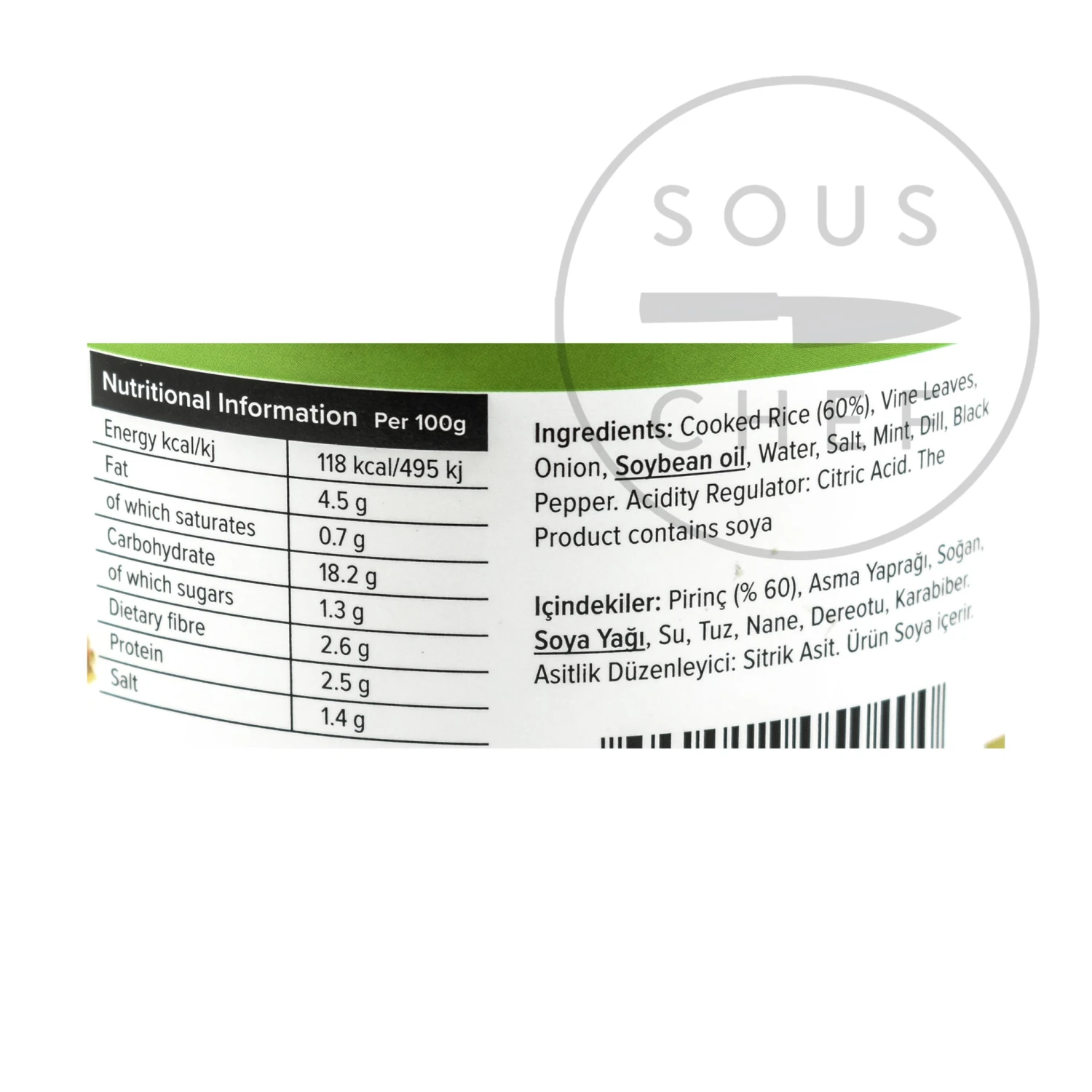 Ingredients: Cooked rice (60%), vine leaves, onion, soybean oil, water, salt, mint, dill, black pepper. Acidity regulator: citric acid.Â