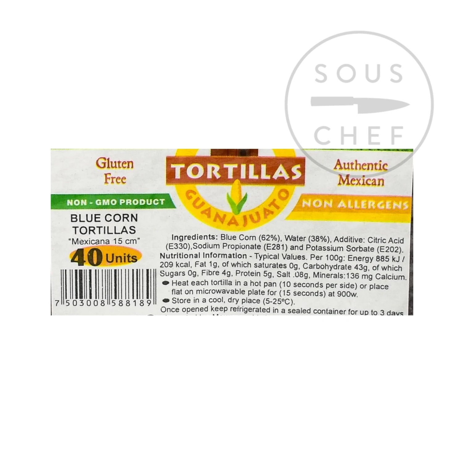 Ingredients: Blue corn 62%, water 38%, citric acid (E330), sodium propionate E281 and potassium sorbate (E202).