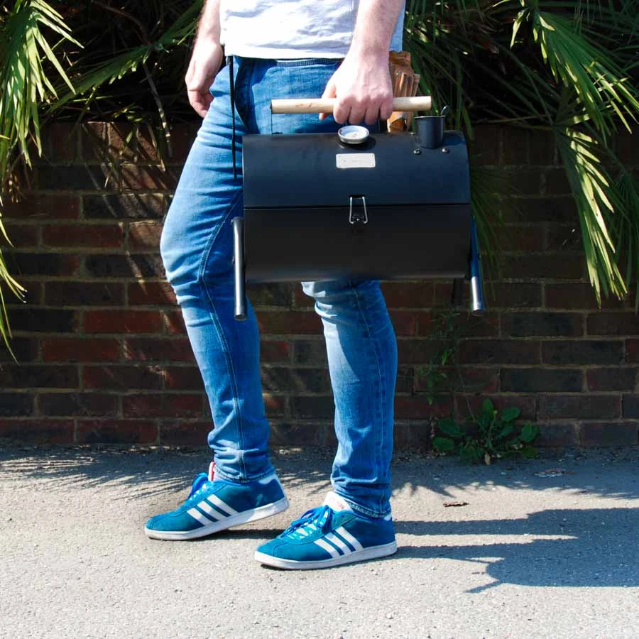 The tabletop BBQ smoker comes with grills for charcoal and food, adjustable air vents in the top and sides and a thermometer to monitor the internal temperature.