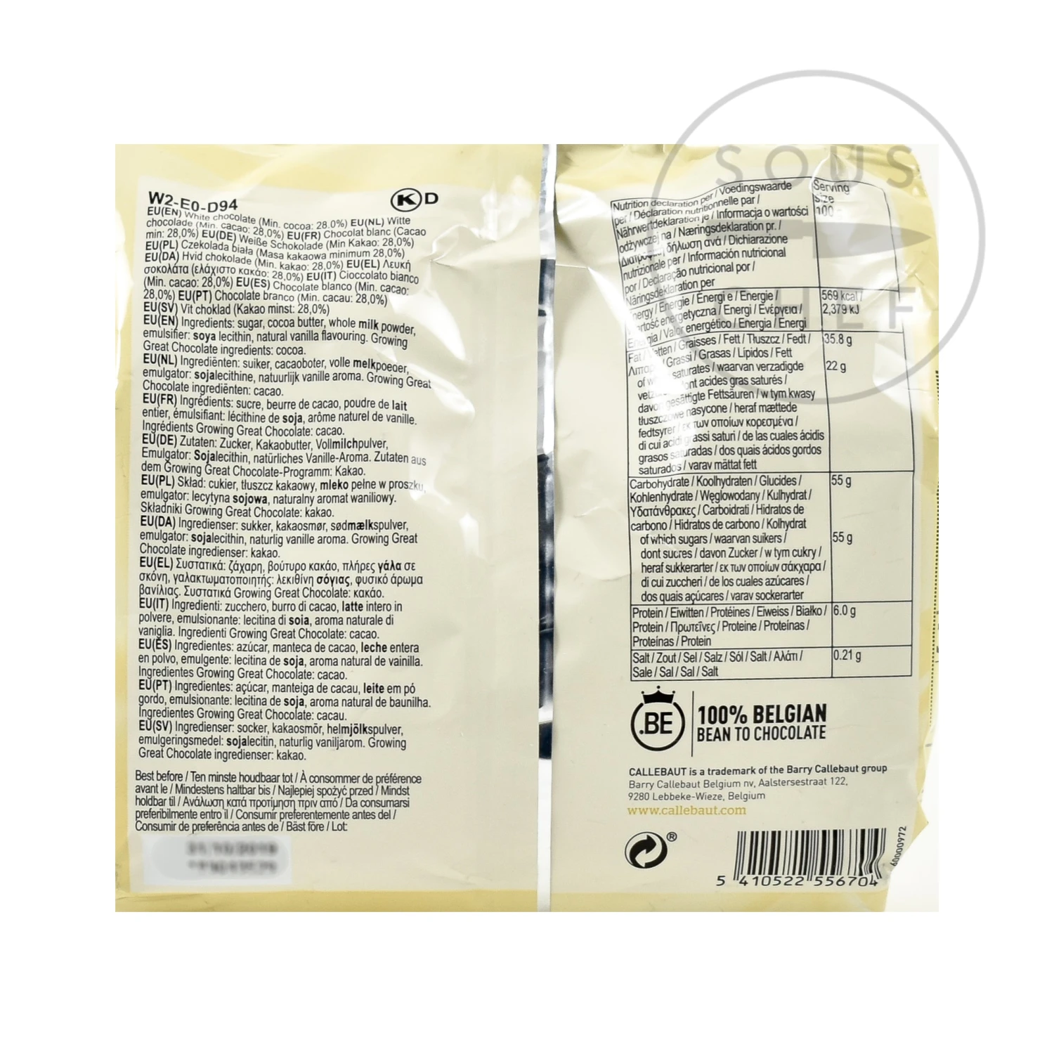 Callebaut white couverture has intensely creamy, milky notes. The all-purpose stunning quality white chocolate can be used for making ganaches, sauces, ice creams, pralines and for doing chocolate work – such as moulding hollow figures, and intricate decorating. It can even be combined with dark chocolate or milk chocolate couverture to achieve a two-colour effect in chocolate decoration or swirls in chocolate brownies.