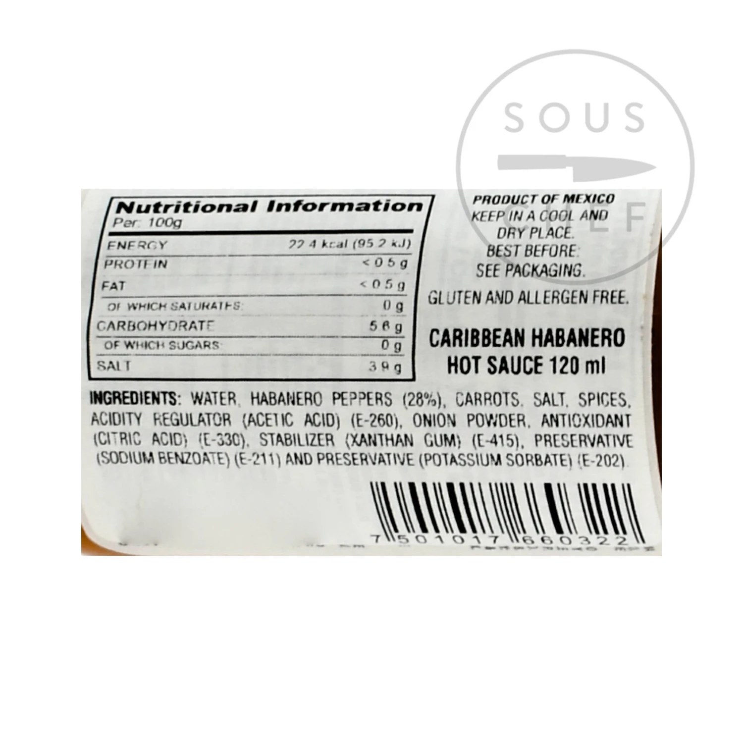Ingredients: water, habanero peppers (28%), carrots, salt, spices, acetic acid E260, onion powder, citric acid E330, xanthan gum E415, sodium benzoate E211, potassium sorbate E202.