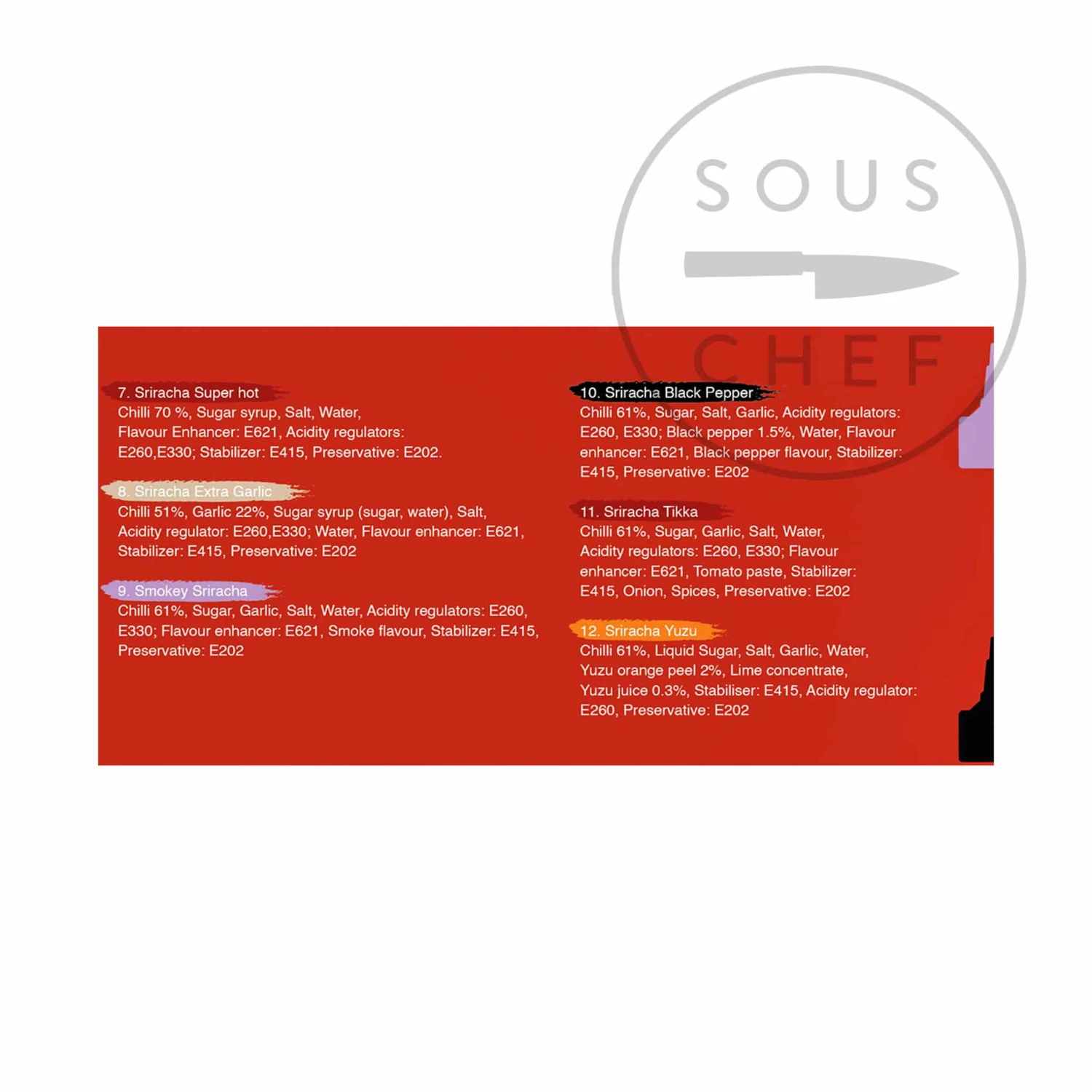 Ingredients: Sriracha Original: Chilli (64%), sugar, water, salt, garlic, flavour enhancer: E621, stabilizer: E415, Acidity regulators: E260, E330; preservative E202. Sriracha Mayo: Water, chilli (20%), soybean oil, sugar, distilled vinegar, modified corn starch, salt, stabilizer: E415, garlic, mustard seeds, acidity regulators: E260, E330; flavour enhancer: E621, preservative: E202, antioxidant: E319. Sriracha Yellow Chilli: Yellow chilli (66%), sugar, salt, water, flavour enhancer: E621, acidity regulators: E260, E330; stabilizer: E415, preservative: E202. Sriracha Green Chilli: Green chilli (54%), sugar, garlic, salt, water, acidity regulators: E260, E330; flavour enhancer: E621, stabilizer: E415, preservative: E202. Sriracha Wasabi: Chilli, sugar, water, garlic, salt, wasabi paste (4%): (horseradish, wasabi 10%, corn starch, soybean oil, water, salt, wasabi flavour), wasabi flavour (0.1%), flavour enhancer: E621, stabilizer: E415, acidity regulators: E260, E330; preservative: E202. Sriracha Blackout: Chilli (70%), sugar, salt, garlic, water, acidity regulator: E260, flavour enhancer: E621, stabilizer: E415, preservative: E202. Sriracha Super Hot: Chilli (70%), sugar syrup (sugar, water), salt, water, flavour enhancer: E621, acidity regulators: E260, E330; stabilizer: E415, preservative: E202. Sriracha Extra Garlic: Chilli (51%), garlic (22%), sugar syrup (sugar, water), salt, acidity regulators: E260, E330; water, flavour enhancer: E621, stabilizer: E415, preservative: E202. Smokey Sriracha: Chilli (61%), sugar, garlic, salt, water, acidity regulators: E260, E330;  flavour enhancer: E621, smoke flavour, stabilizer: E415, preservative: E202. Sriracha Black Pepper: Chilli (61%), sugar, salt, garlic, acidity regulators: E260, E330; black pepper (1.5%), water, flavour enhancer: E621, black pepper flavour, stabilizer: E415, preservative: E202. Sriracha Tikka: Chilli (61%) sugar, garlic, salt, water, acidity regulators: E260, E330;  flavour enhancer: E621, tomato paste, stabilizer: E415, onion, spices, preservative: E202. Sriracha Yuzu: Chilli (61%), liquid sugar, salt, garlic, water, yuzu orange peel (2%), Lime concentrate, yuzu juice (0.3%) stabilizer: E415, acidity regulator: E260, preservative: E202.