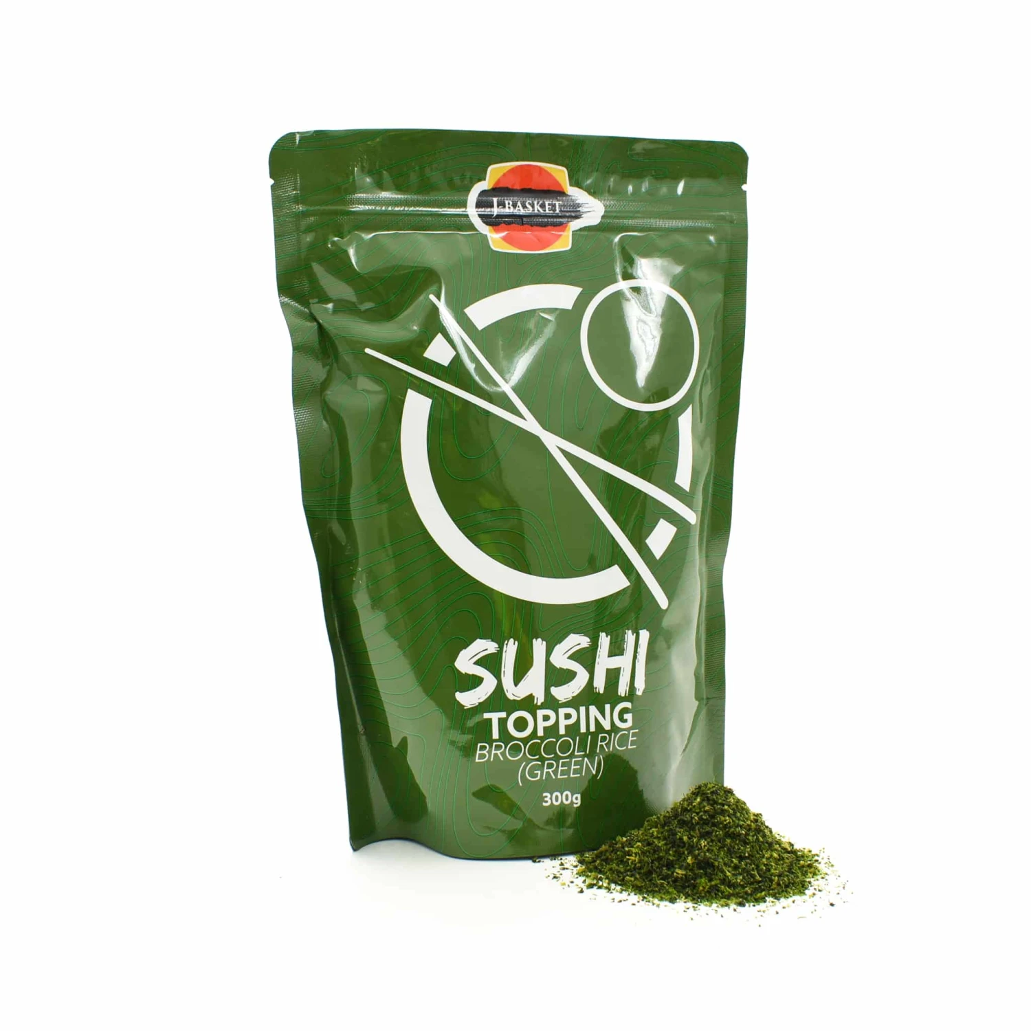 J-Basket’s green broccoli sushi topping adds a salty, savoury crunch to fresh sushi and rice bowls. These dark green flakes are made from 100% dried and salted broccoli, and offer an instant way to add the fresh, earthy flavour of the green vegetable to any dish.Â