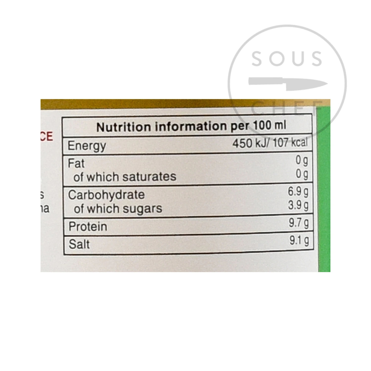 Ingredients: water, soybeans, wheat, salt, spirit vinegar, alcohol, sugar. Contains allergens: soya, gluten (wheat).
