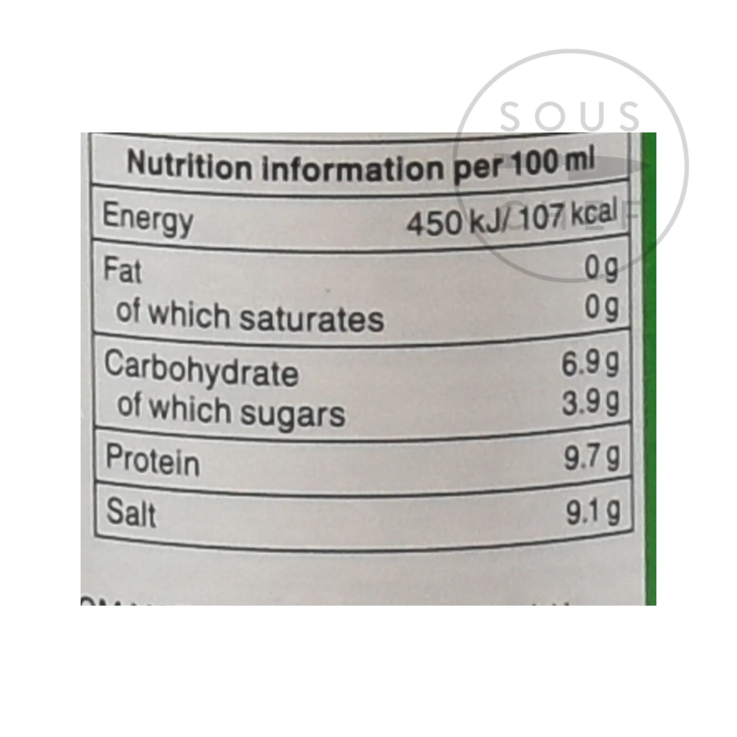 Ingredients: Water, soybeans, wheat, salt, ethanol, sugar, acidity regulator. Contains gluten and soya.