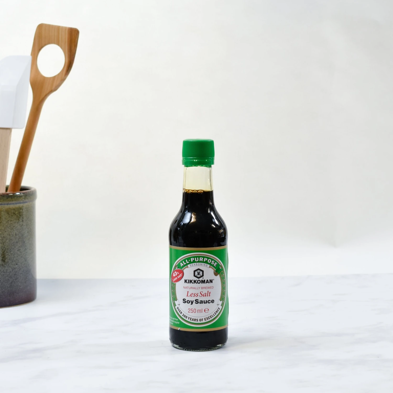 Kikkoman reduced salt soy sauce is an entirely natural variety, made from soybeans, water, wheat and salt. Three months into the traditional brewing process, the ‘Maillard Reaction’ turns the sauce into a clear, red-brown colour – so no additives or syrups are needed to enhance Kikkoman soy sauce’s colour or flavour. The resulting ‘less salt soy sauce’ is a complex and well-balanced sauce containing 300 natural aroma components. The salt content is reduced using a special fermentation process which retains the unique flavour of traditional Kikkoman soy sauce, but with 43% less salt.Â