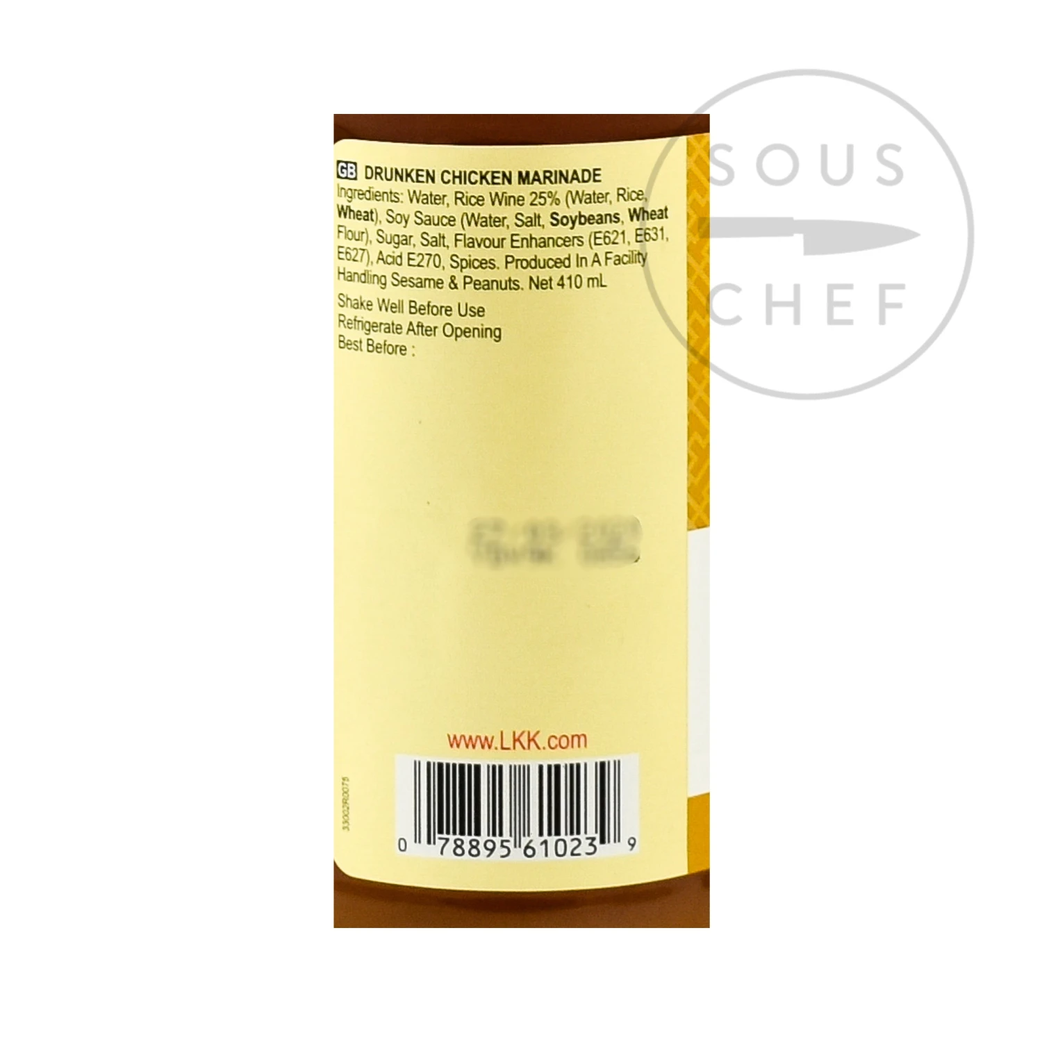 Ingredients: Water, Rice Wine 25% (Water, Rice, Wheat), Soy Sauce (Water, Salt, Soybeans, Wheat Flour), Sugar, Salt, Flavour Enhancers (E621, E631, E627), Acid (E270), Spices. Allergens are listed in bold.