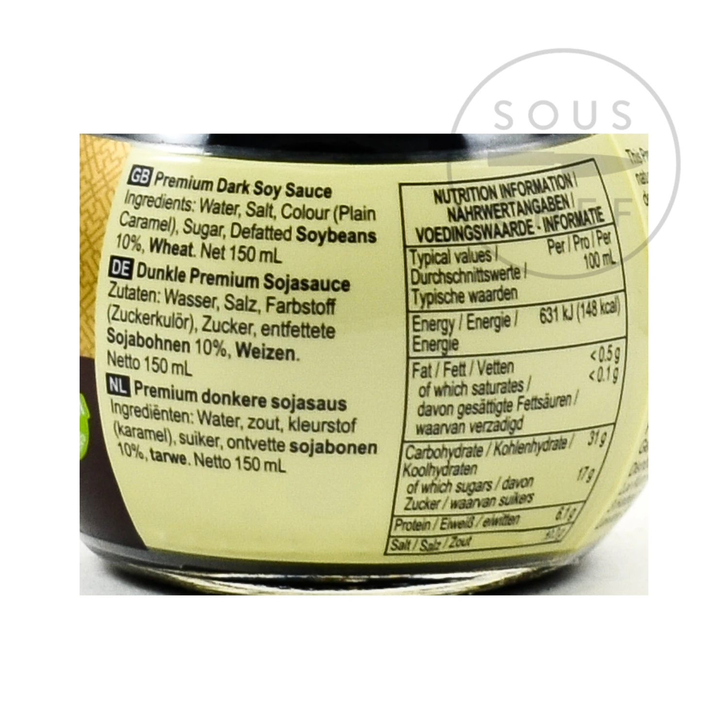 Ingredients: Soy sauce (30%) (water, soybean, salt, wheat flour), colours: e150a, e150c; sugar, salt. Allergens are listed in bold.