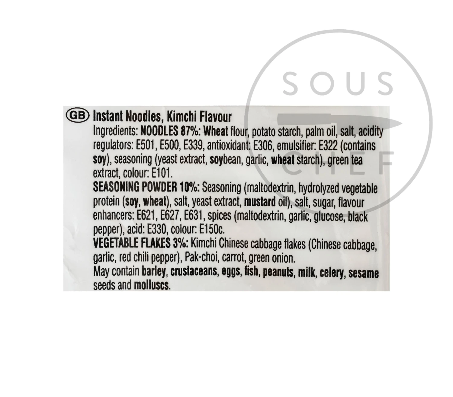 Ingredients: Noodles 87%: Wheat flour, potato starch, palm oil, salt, acidity regulator: E501, E500, E339, antioxidant E306, emulsifier: E322 (contains soy), seasoning (yeast extract, soybean, garlic, wheat starch), green tea extract, colour E101. Seasoning powder 10%: Seasoning (maltodextrin, hydrolyzed vegetable protein (soy, wheat), salt, yeast extract, mustard oil), salt, sugar, flavour enhancers: E621, E627, E631, spices (maltodextrin, garlic, glucose, black pepper), acid: E330, colour: E150c. Vegetable flakes 3%: kimchi Chinese cabbage flakes (Chinese cabbage, garlic, red chilli pepper), Pak-choi, carrot, green onion.