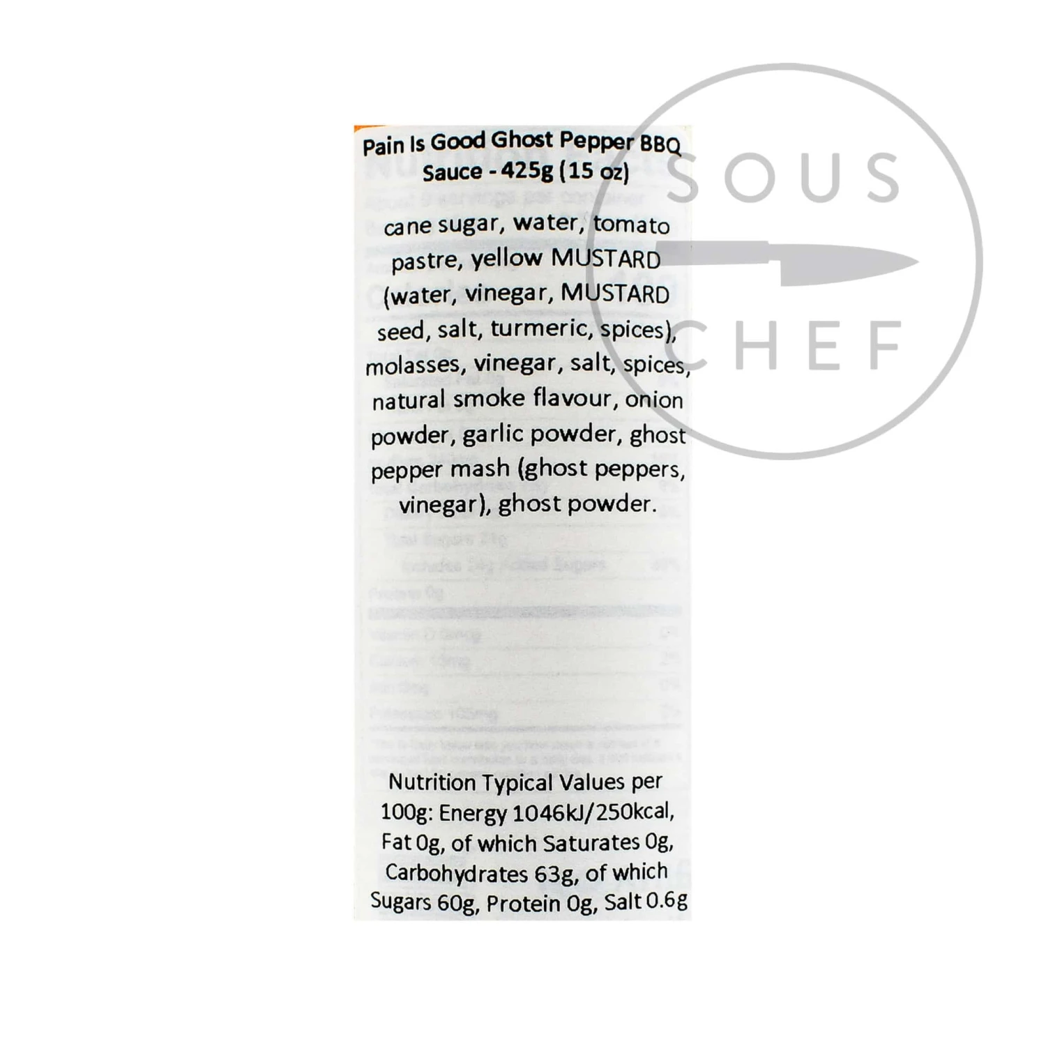 Ingredients: water, cane sugar, tomato paste, yellow mustard (water, vinegar, mustard seed, salt, turmeric, spices), molasses, vinegar, salt, spices, natural smoke flavour, onion powder, garlic powder, ghost pepper mash (ghost peppers, vinegar), ghost powder.Â