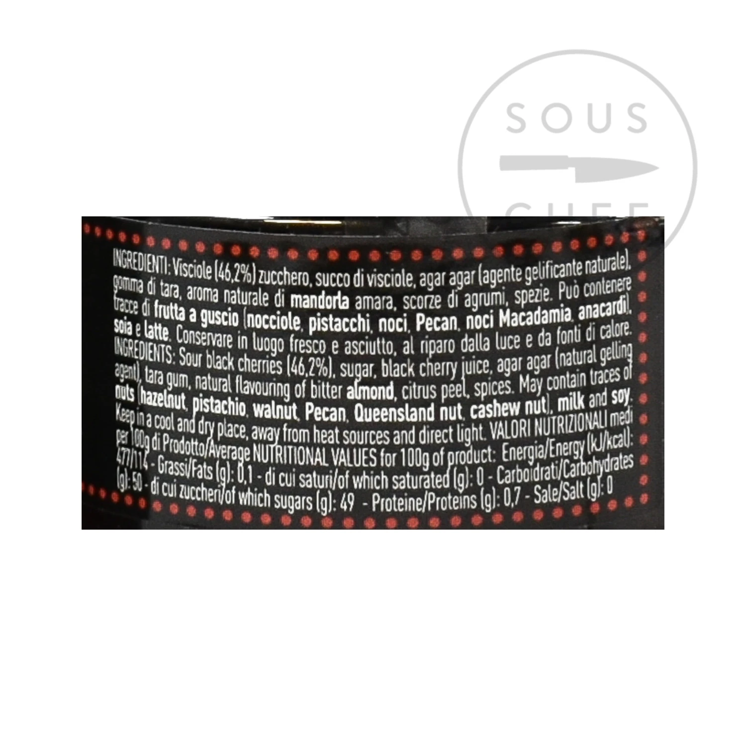 Ingredients: sour black cherries (46.2%), sugar, black cherry juice, agar agar (natural gelling agent), tara gum, natural flavouring of bitter almond, citrus peel, spices. Allergens are listed in bold. May also contain traces of nuts (hazelnut, pistachio, walnut, Pecan, Queensland nut, cashew nut), milk, and soy. May contain cores.