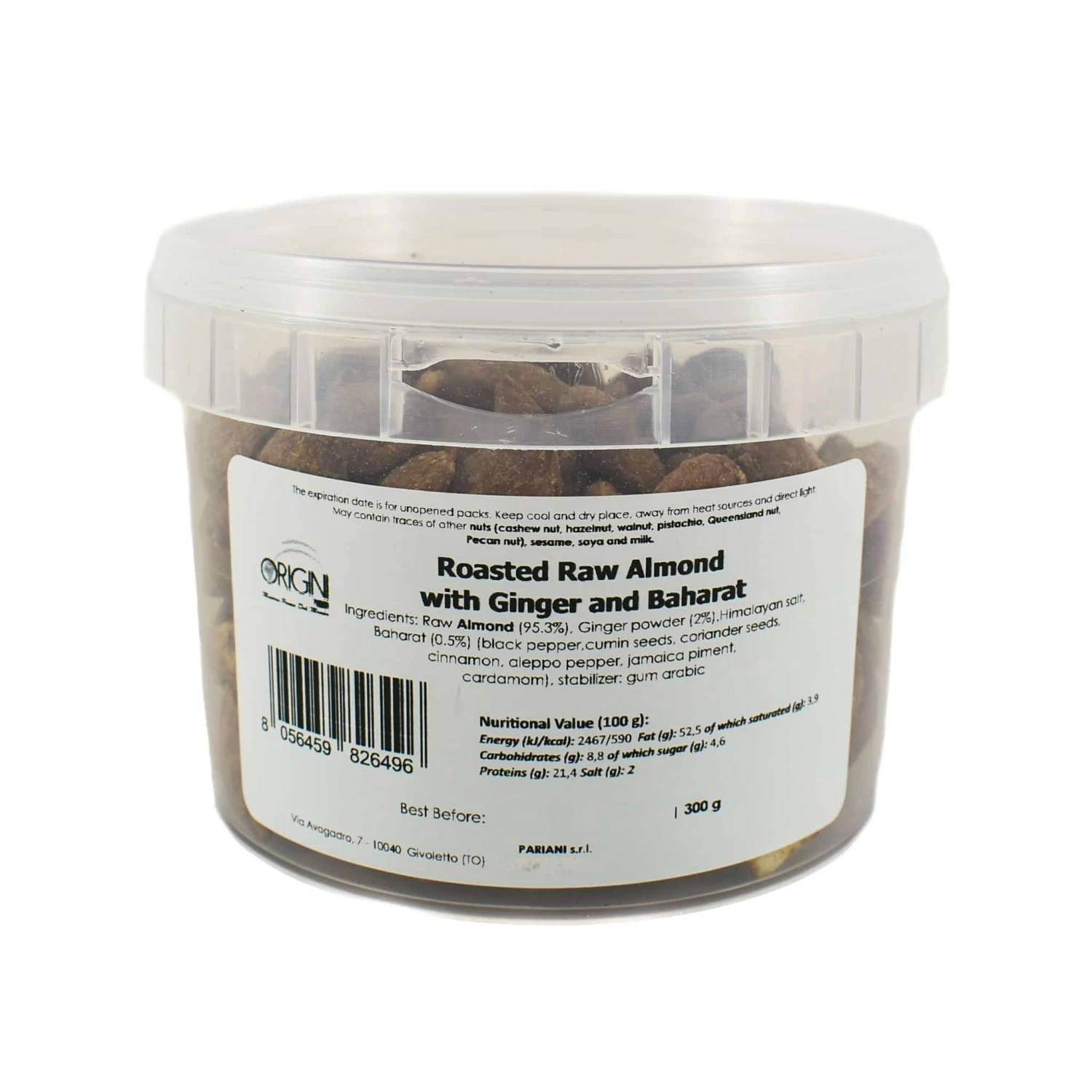 Ingredients: Raw almond (95.3%), ginger powder (2%), Himalayan salt, Baharat (0.5%) (black pepper, cumin seeds, coriander seeds, cinnamon, Aleppo pepper, Jamaica piment, cardamom), stabiliser: gum arabicÂ