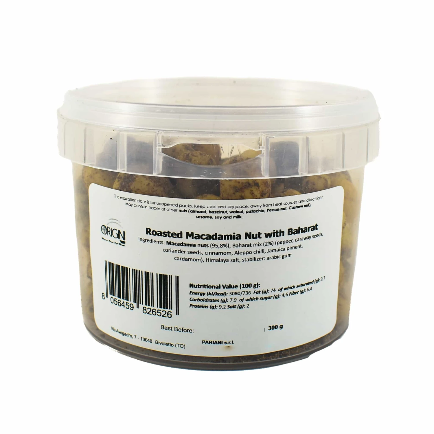 Ingredients: Macadamia nuts (95.8%), Baharat mix (2%) (pepper, caraway seeds, coriander seeds, cinnamon, Aleppo chilli, Jamaica piment, cardamom), Himalayan salt, water, stabilizer: acacia gum