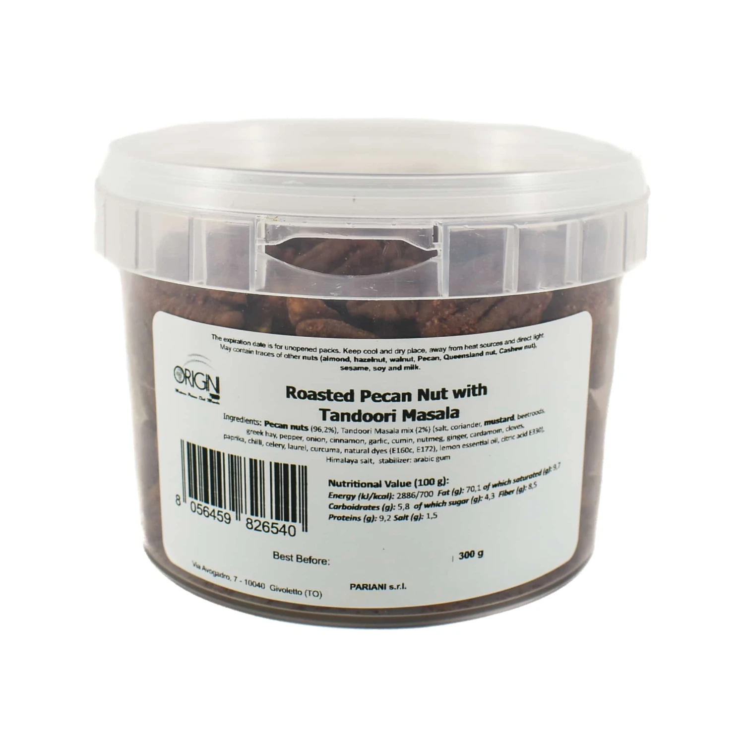 Ingredients: Pecan nuts (96.2%), Tandoori Masala mix (2%) (salt, coriander, mustard, beetroots, greek hay, pepper, onion, cinnamon, garlic, cumin, nutmeg, ginger, cardamom, cloves, paprika, chilli, celery, laurel, curcuma, natural dyes (E160c, E172), lemon essential oil, citric acid E330), Himalayan salt, water, stabilizer: acacia gum.