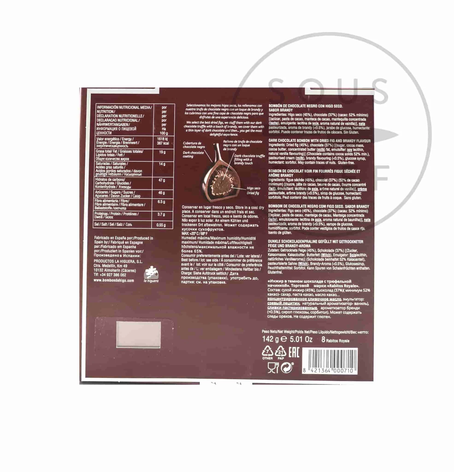 Rabitos royale chocolate figs are a cult Spanish dinner treat. Enjoy rabitos royale chocolate figs as an indulgent accompaniment to a strong coffee or evening liqueur. The slightly chewy figs are filled with a velvety chocolate and brandy ganache, and coated in rich, smooth dark chocolate for a luxurious treat. The figs are a small, sweet variety called Pajarero, a speciality of the Extremadura region of Spain.
