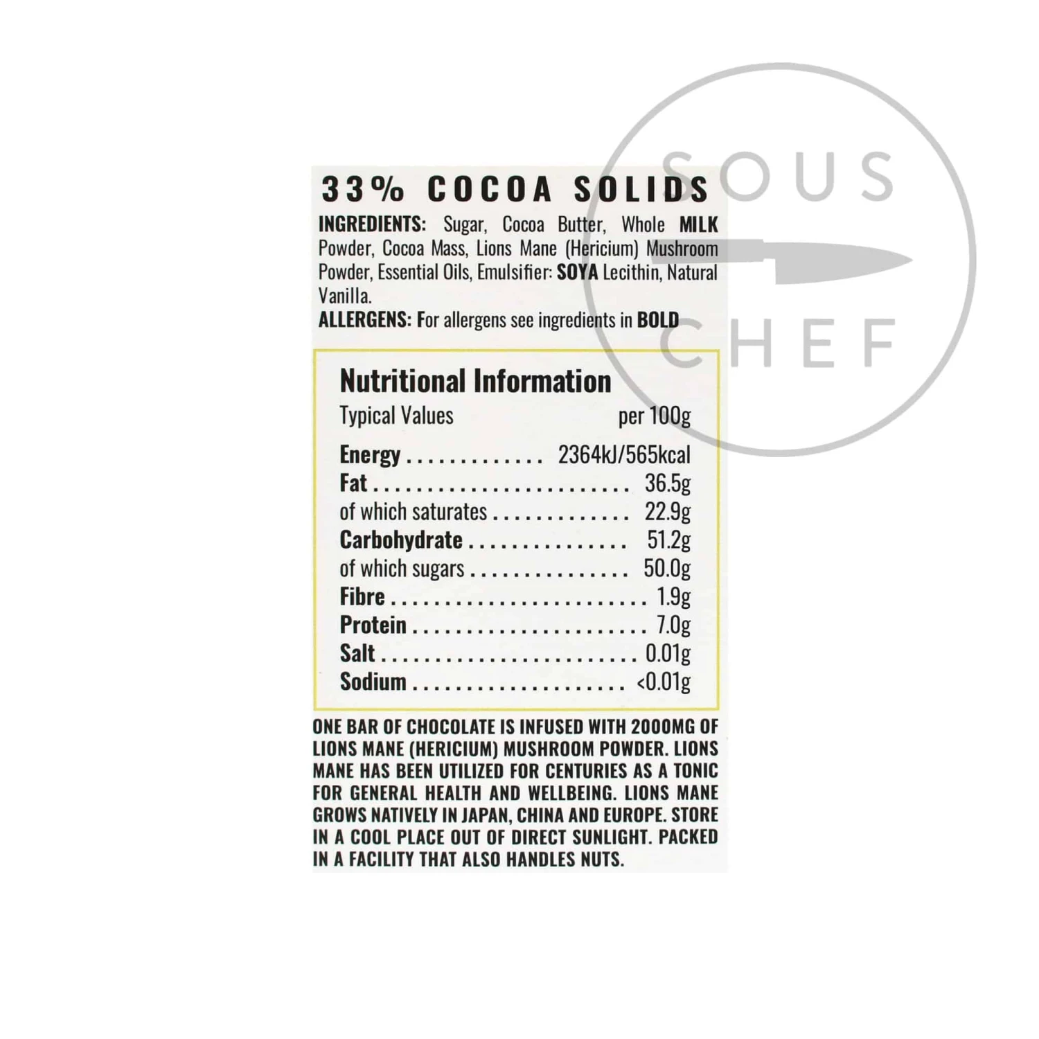 Ingredients: Sugar, Cocoa Butter, Whole Milk Powder, Cocoa Mass, Lions Mane (Hericum) Mushroom Powder, Essential Oils, Emulsifier: Soya Lecithin, Natural Vanilla.