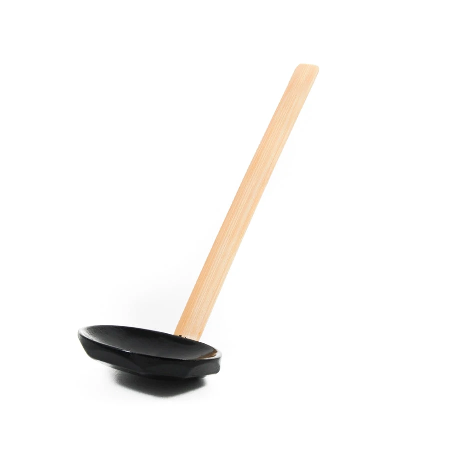 Traditional udon and ramen (noodle soup) ladle featuring natural bamboo handle and black varnished spoon.