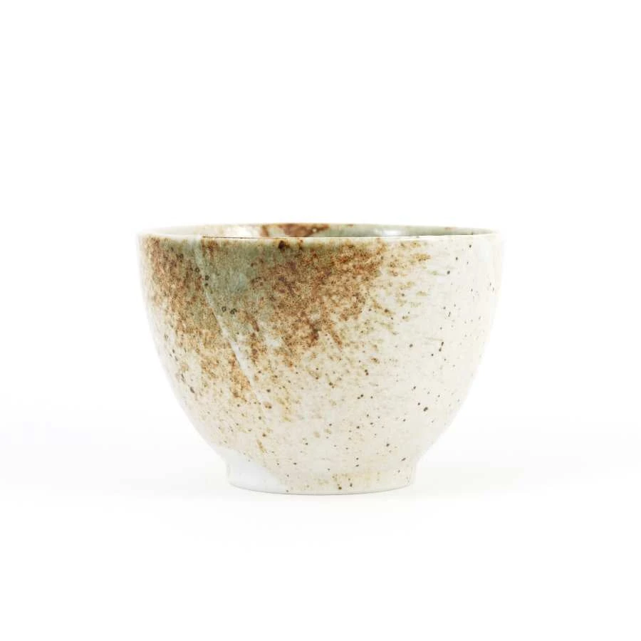 Textured, small Japanese stoneware bowl in neutral colours, traditionally used for rice.