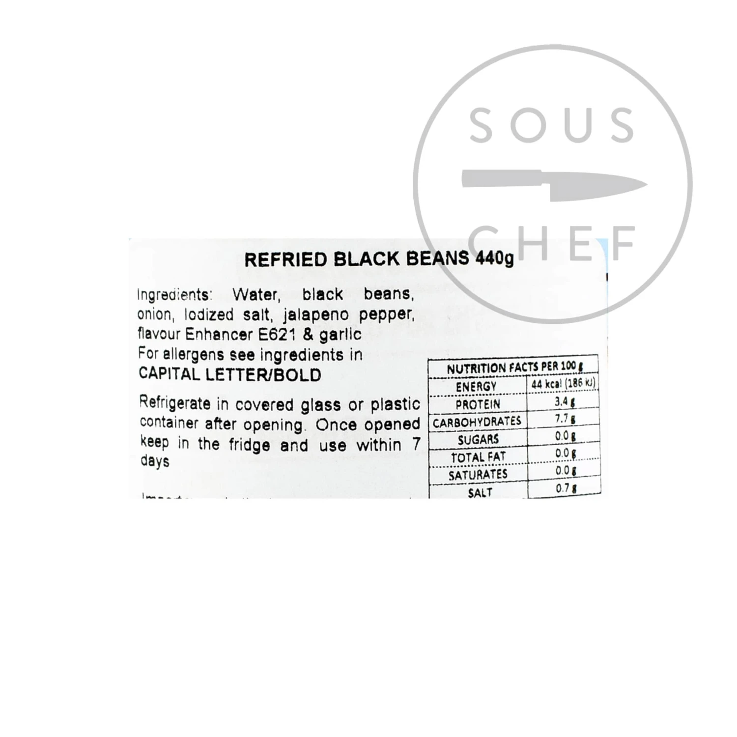 Ingredients: water, black beans, onions, iodised salt, jalapeno pepper, flavour enhancer E621 (monosodium glutamate) and garlic. Contains MSG.