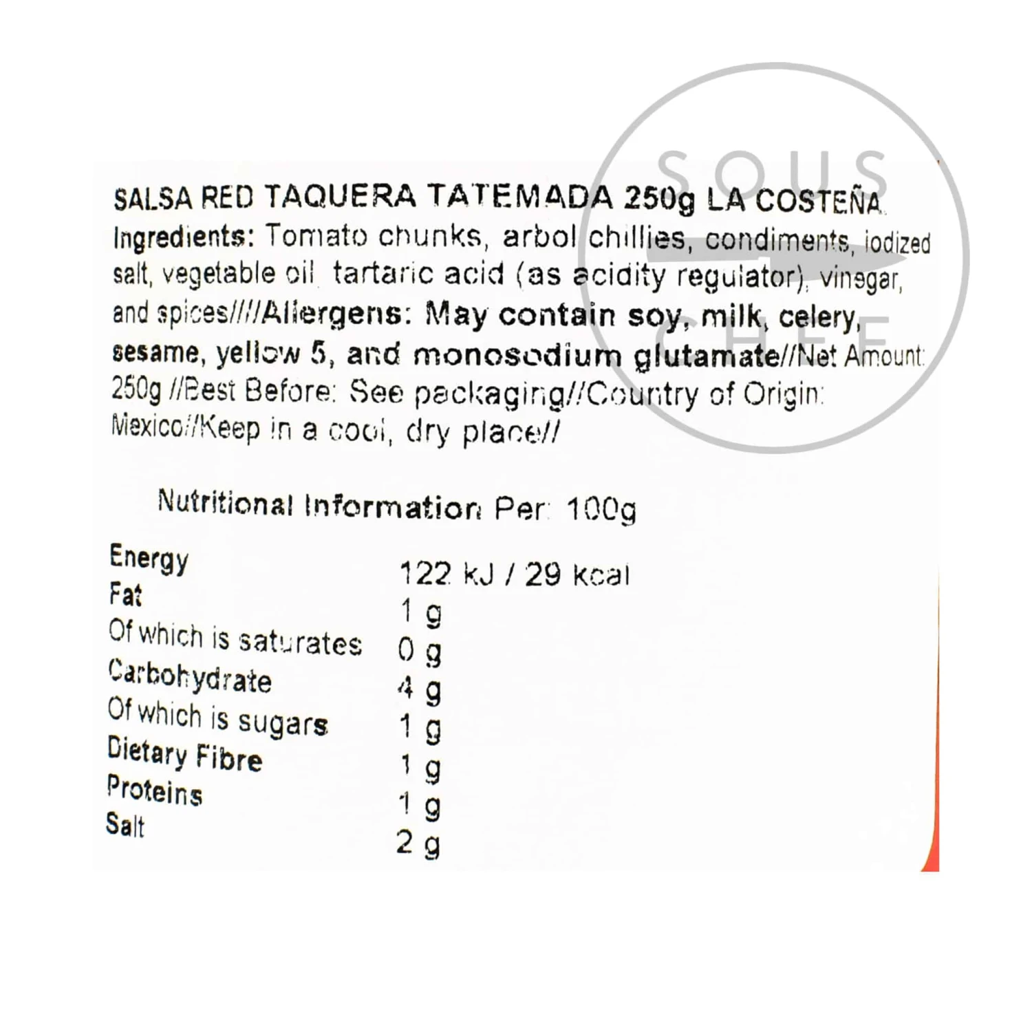 La Costena’s salsa taquera is a sweet and spicy continent with a strong tomato flavour and powerful chilli kick. Beginning with a tangy tomato base, this salsa is blended with Arbol chillies to a fine textured sauce that is perfect to pour over nachos or use to dip hot tamales. It has an immediate fierce kick on the tongue that mellows for a sweeter yet still fiery finish – this is a salsa for those who like condiments that pack a punch!
