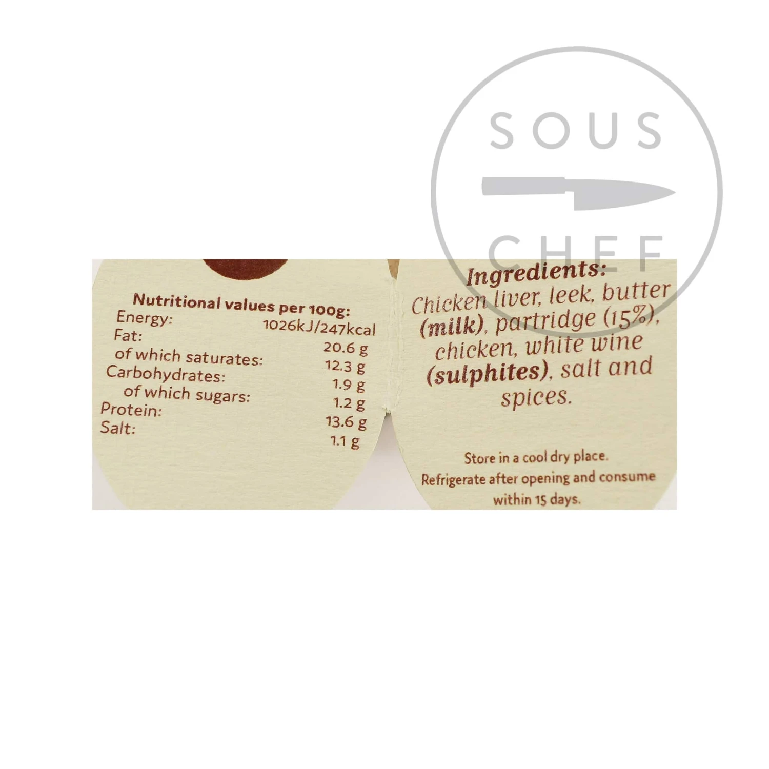Ingredients: chicken liver, leek, butter (milk), partridge (15%), chicken, white wine (sulphites), salt and spices.Â