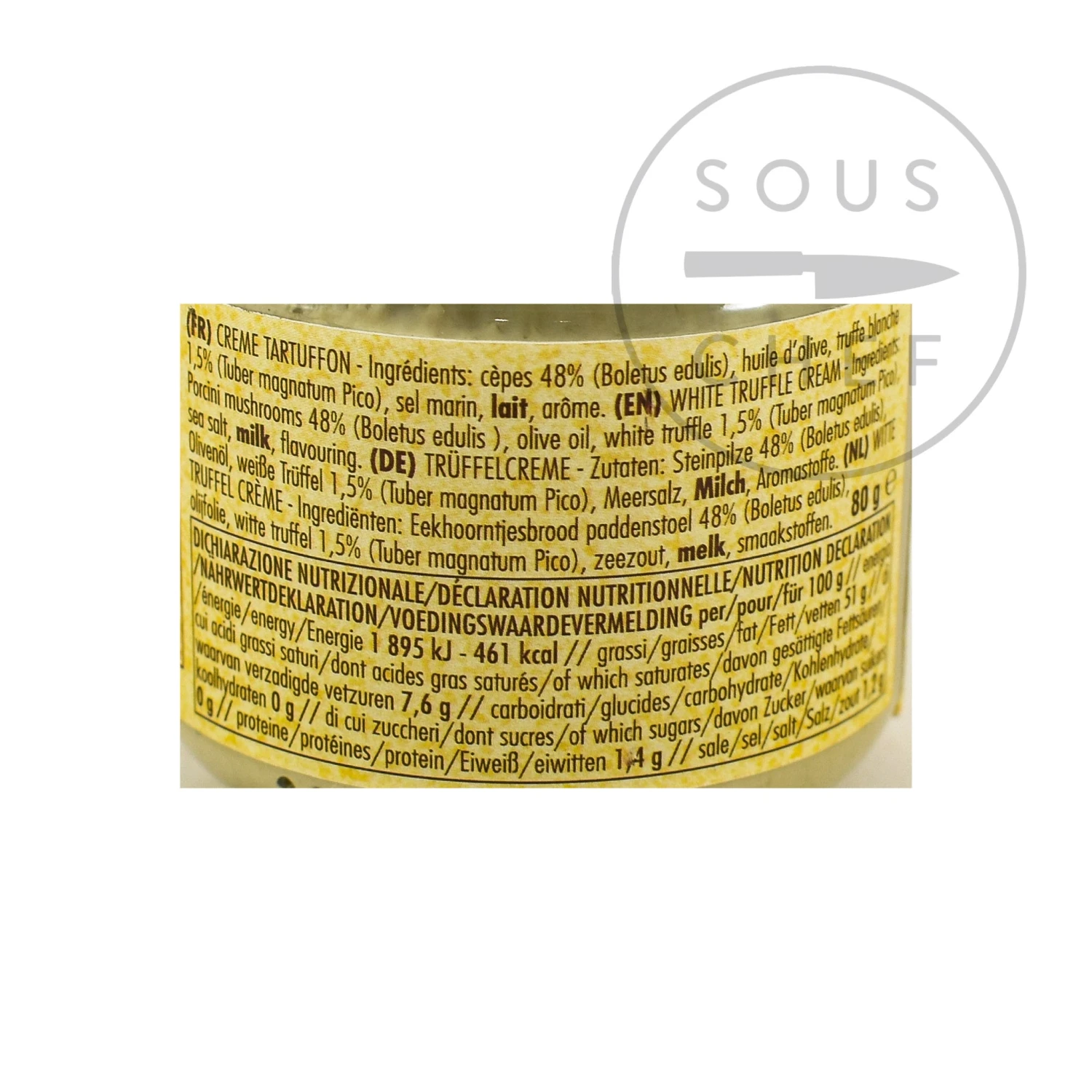 Ingredients: Porcini mushrooms 47% (Boletus edulis), olive oil, white truffle 1.5% (Tuber magnatum Pico), sea salt, milk, flavouring,Â