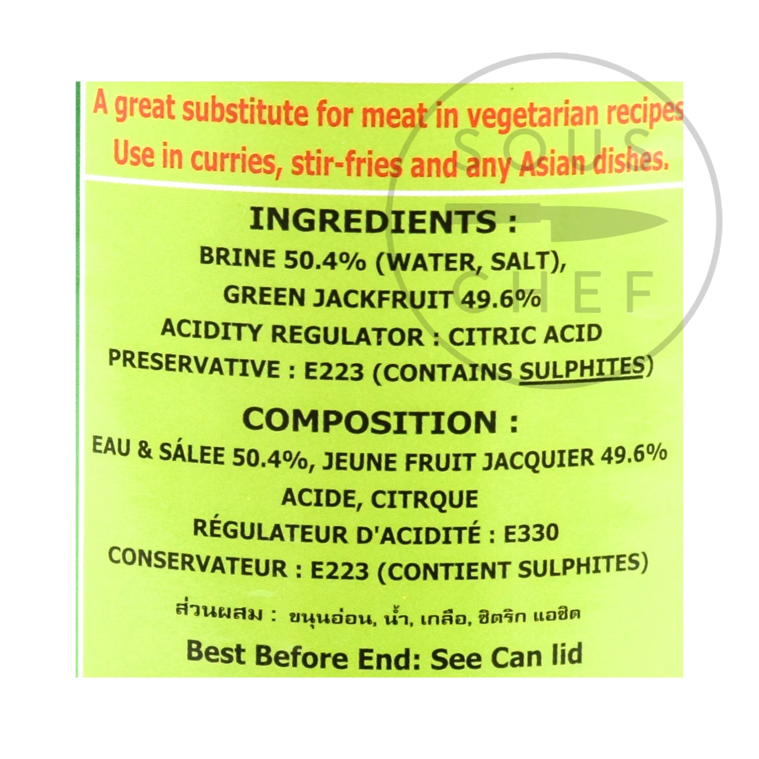 Ingredients: Brine 50.4% (Water, Salt), Green Jackfruit 49.6%, Acidity Regulator: Citric Acid, Preservative: E223 (contains sulphites)