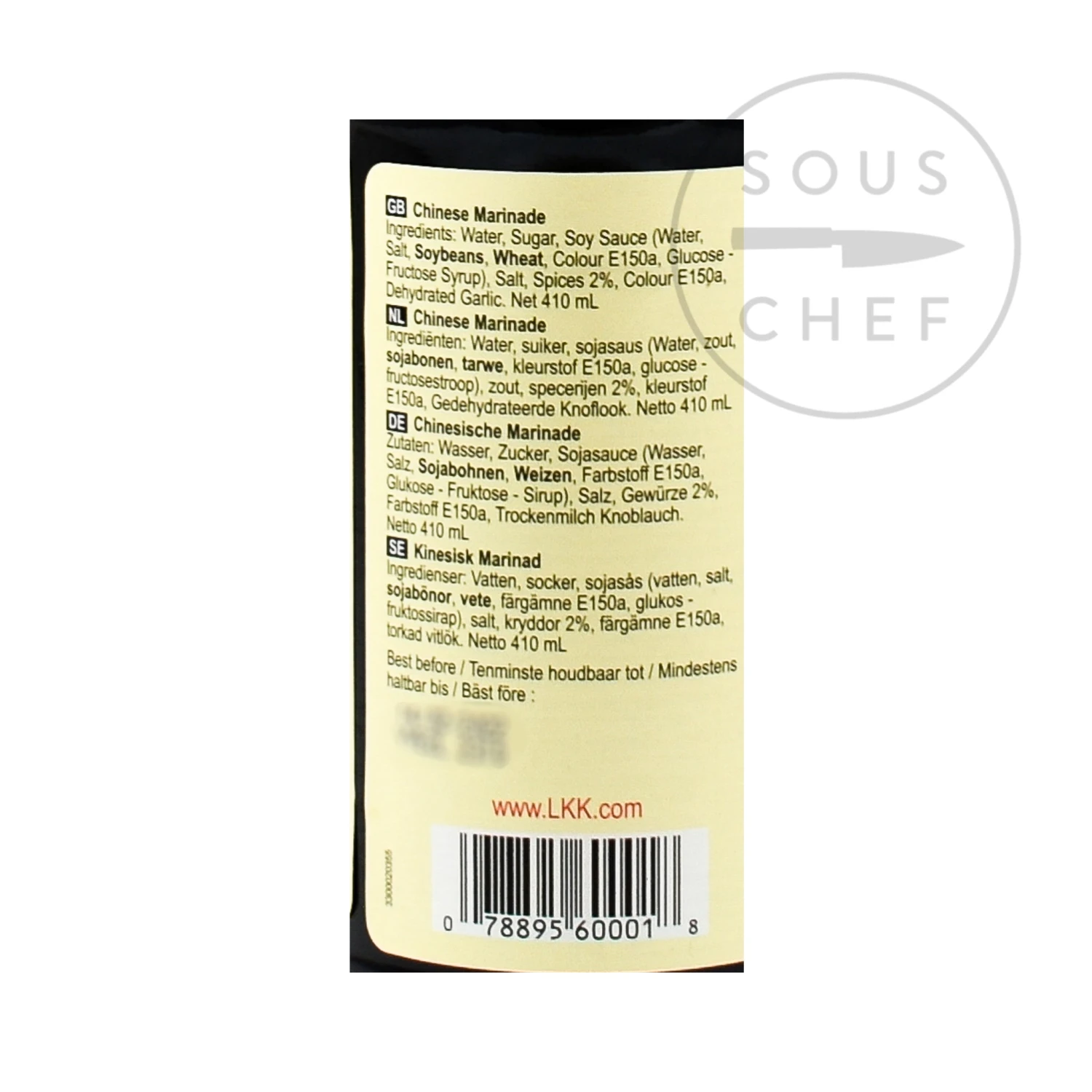 Ingredients: Water, Sugar, Soy Sauce (Water, Salt, Soybeans, Wheat, Colour E150a, Glucose – Fructose Syrup), Salt, Spices 2%, Colour E150a, Dehydrated Garlic. Allergens are listed in bold.