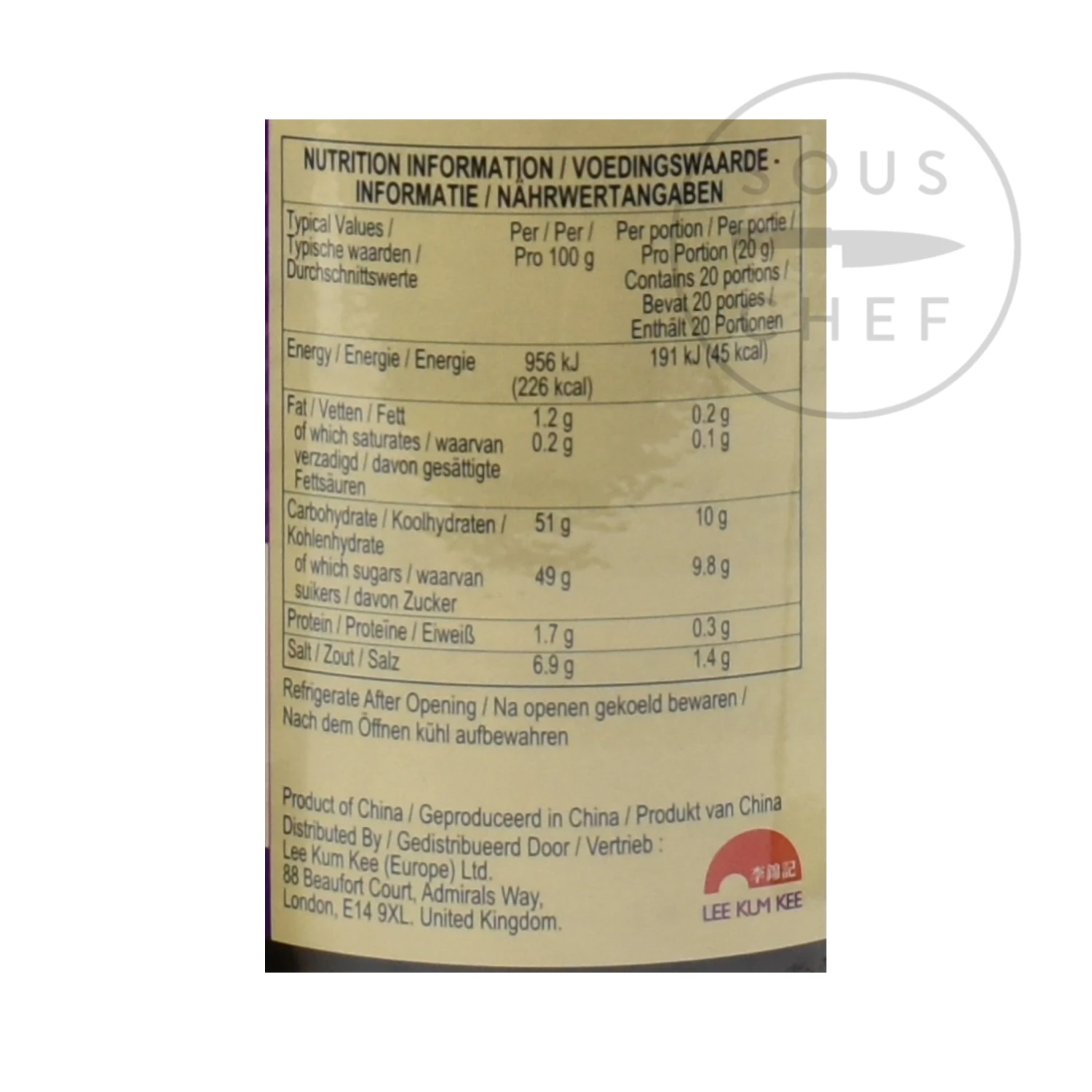 Ingredients: sugar, water, fermented soybean paste (water, salt, soybeans, wheat flour), salt, dried sweet potato, colour E150a, modified corn starch, dehydrated garlic, sesame paste, spices, salted chilli peppers, acid E260. Contains allergens: gluten (wheat), sesame and soy. May contain traces of peanuts.