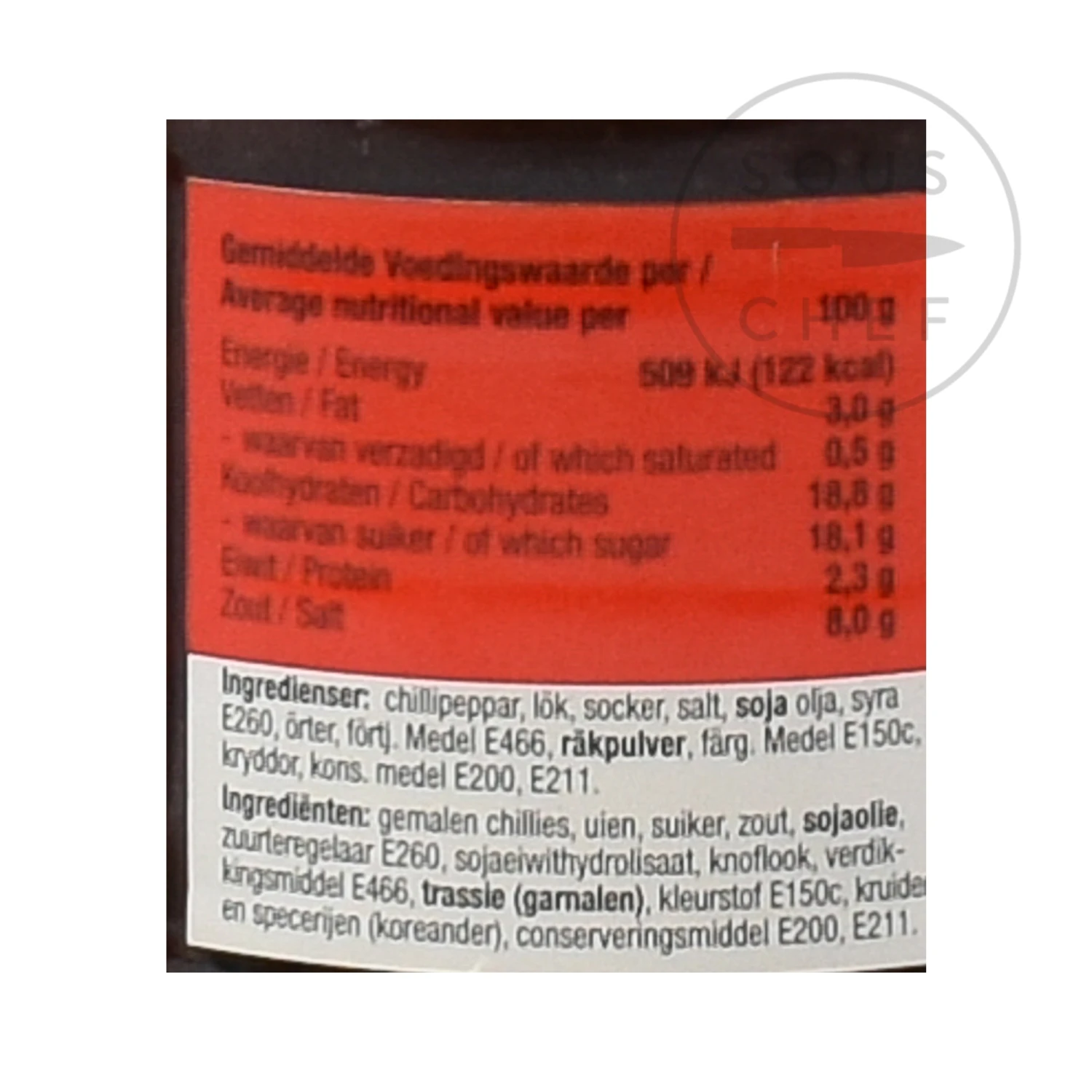 Ingredients: Ground chillies, onions, sugar, salt, soy oil, food acid E260, soy protein hydrolyzate, garlic, thickener E466, shrimp-powder, food colour E150c, spices and herbs (coriander), preservative E200, E211