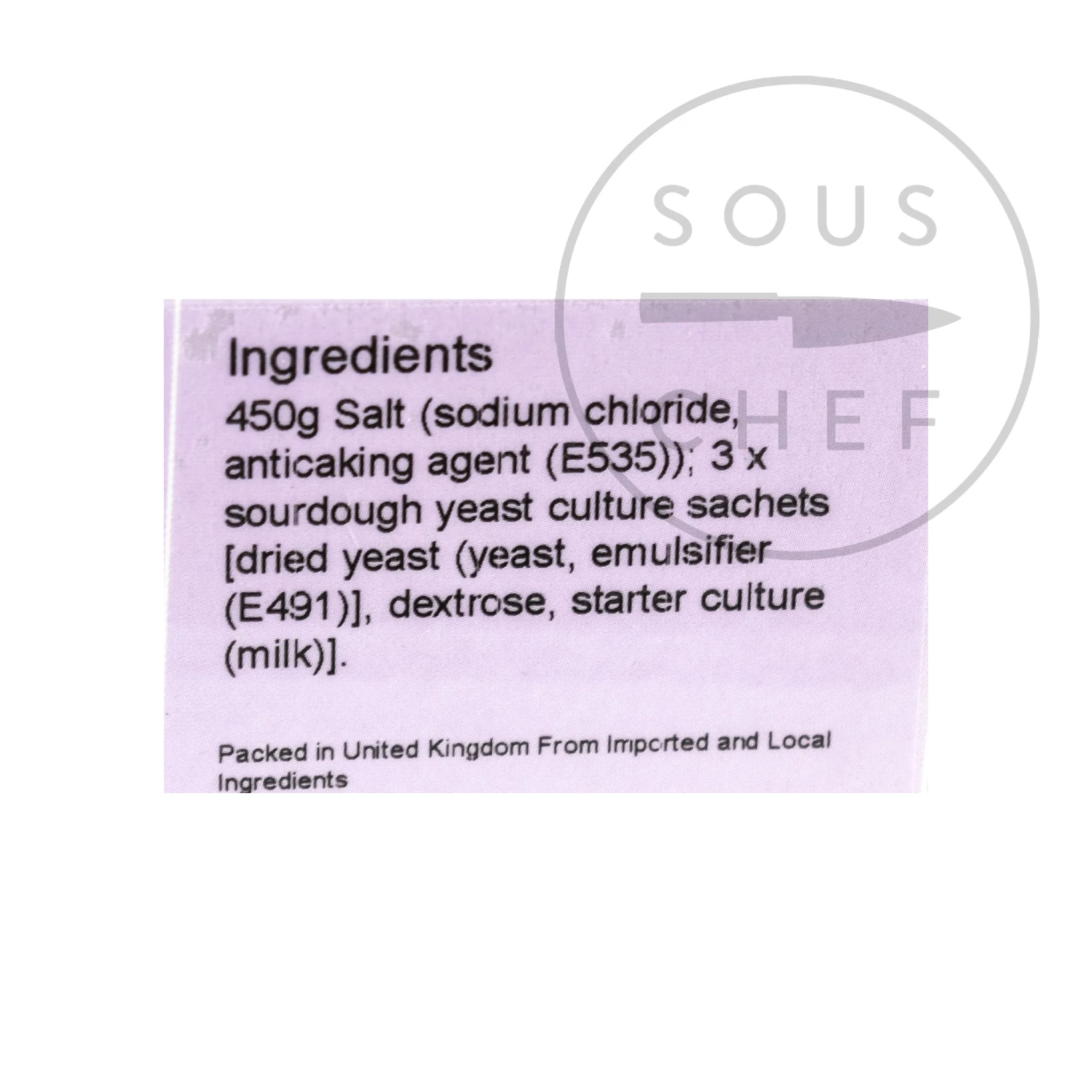 Kit contents: instant sourdough starter culture (enough to make 6 x 500g loaves), artisan salt, muslin cloth, dough scraper, dough whisk, kit instructions, recipe booklet.