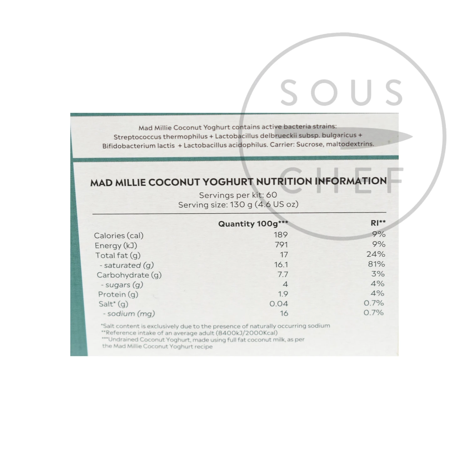 Kit contents: 1L glass jar, thermometer, dairy-free yoghurt culture, thickener (organic tapioca, organic guar & GMO-free maltodextrin from corn), kit instructions, recipe booklet.
