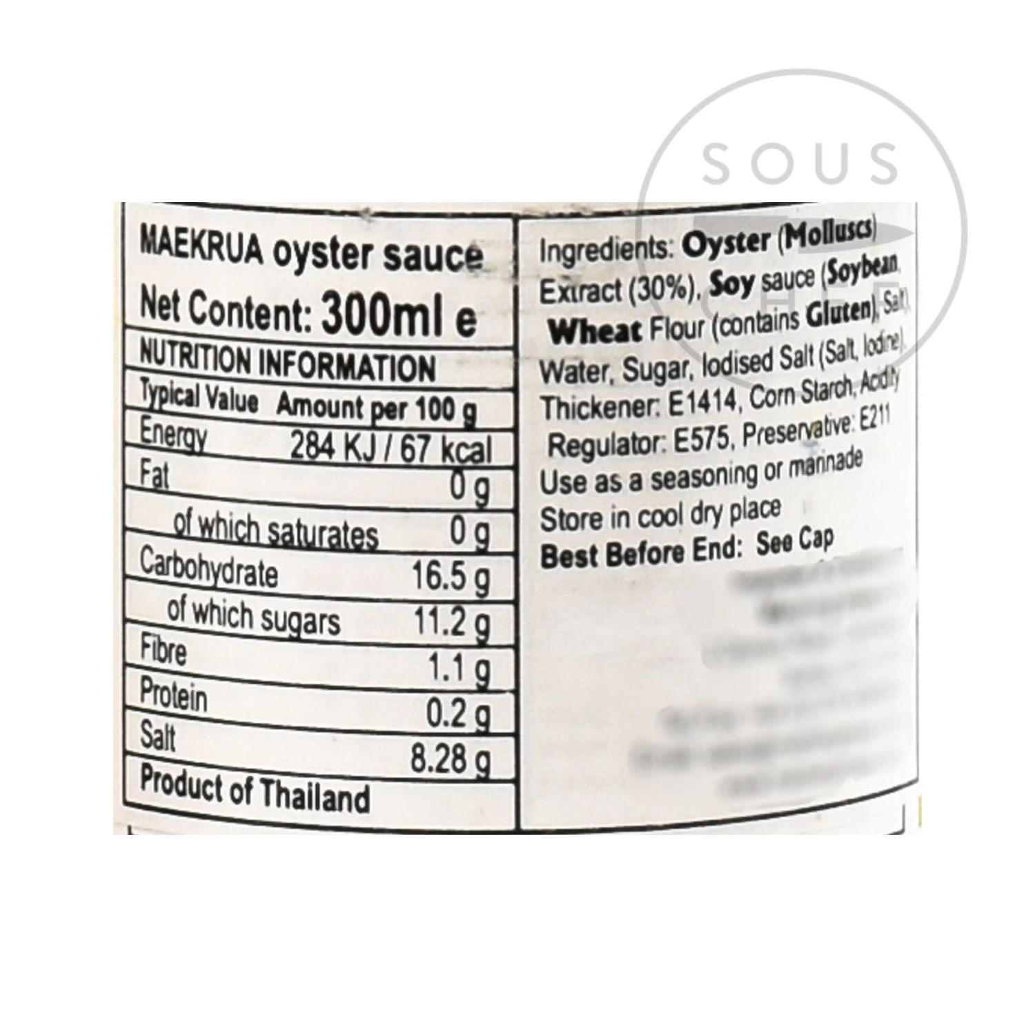 Ingredients: Oyster extract (30%), soy sauce (soybean, wheat flour (contains gluten), salt), water, sugar, iodised salt (salt, iodine), E1414, corn starch, acidity regulator: E575, preservative: E211.