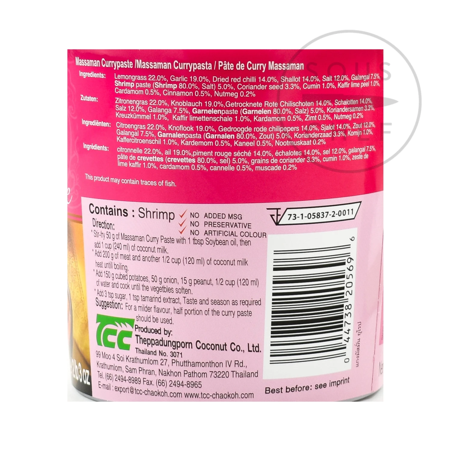 Ingredients: Lemongrass, garlic, dried red chilli, shallot, salt, galangal, shrimp paste (shrimp (crustaceans), salt), coriander seed, cumin, kaffir lime peel, cardamom, cinnamon, nutmeg. Allergens are listed in bold. May contain fish.